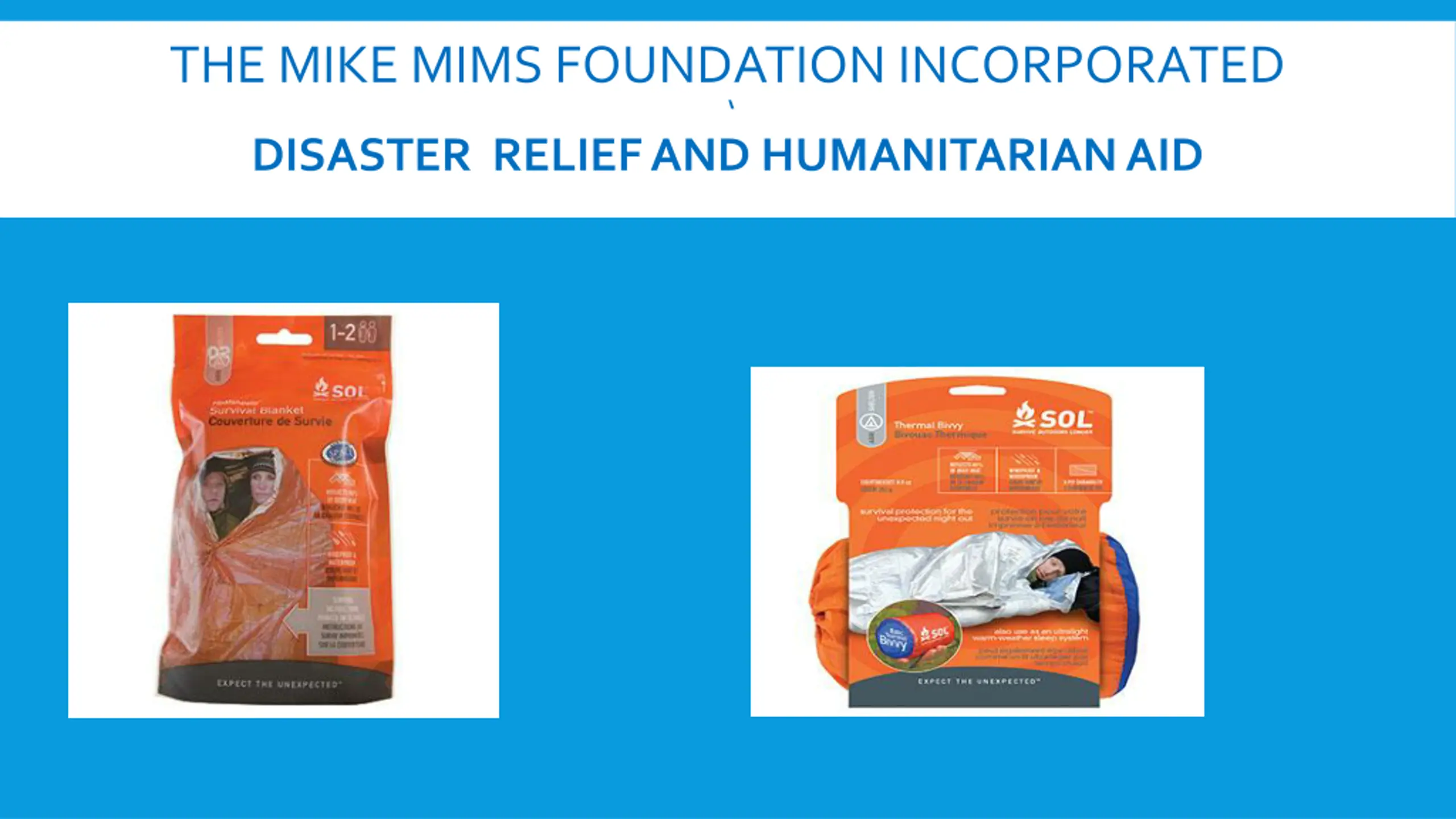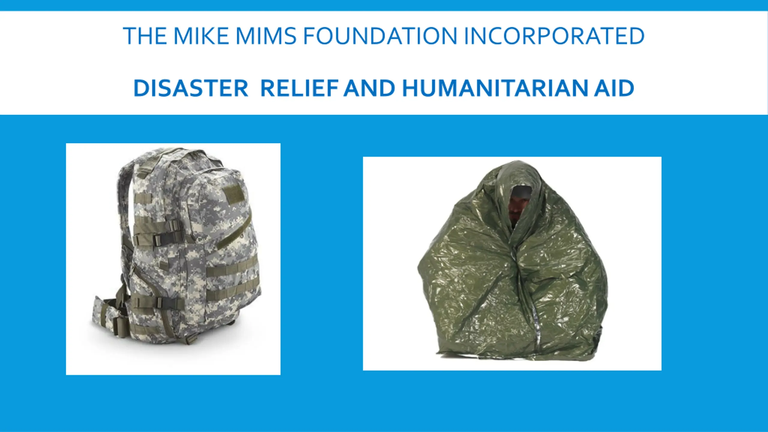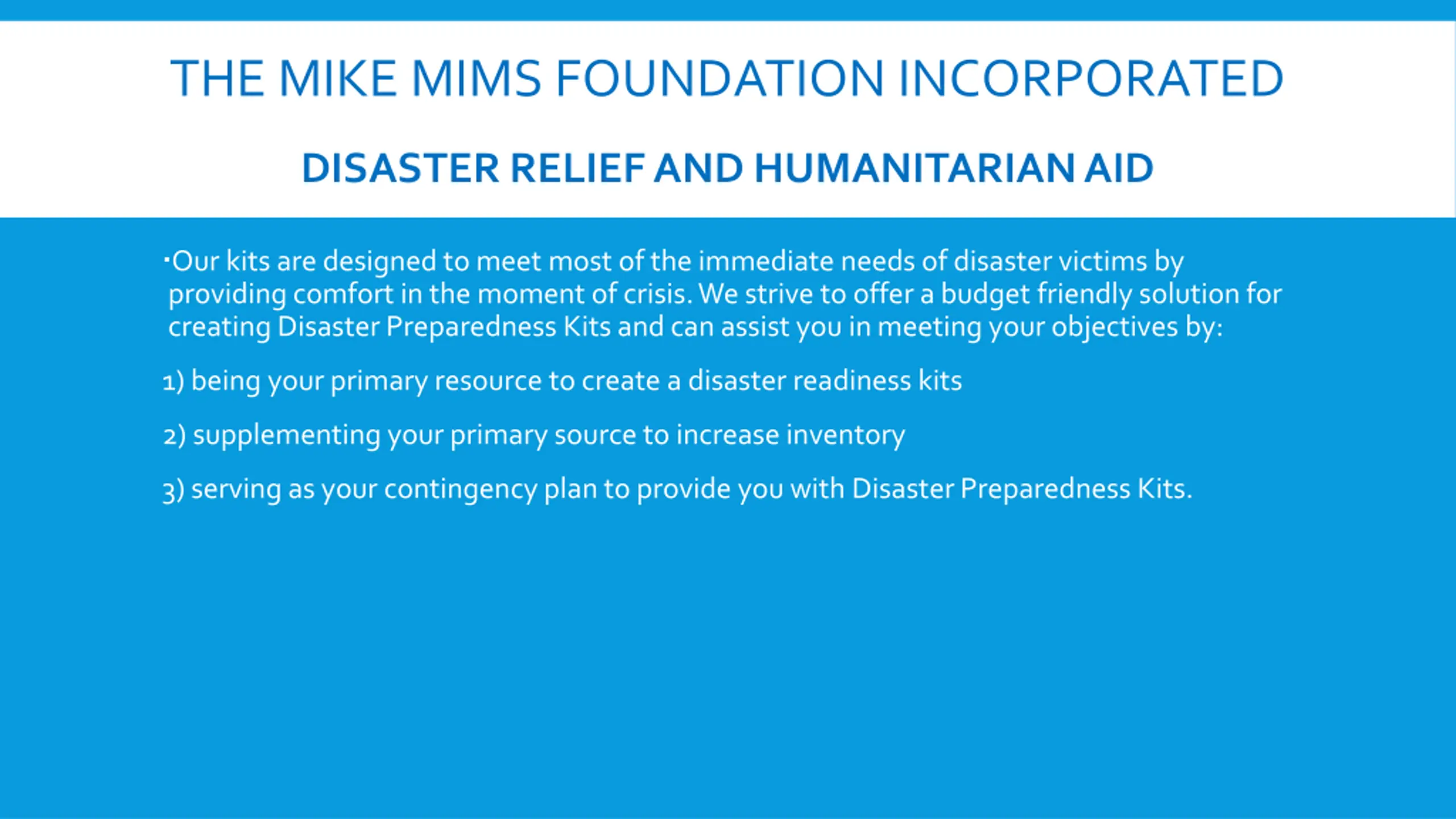 THE MIKE MIMS FOUNDATION INCORPORATED DISASTER RELIEF AND HUMANITARIAN AID Our kits are designed to meet most of the immediate needs of disaster victims by providing comfort in the moment of crisis. We strive to offer a budget friendly solution for creating Disaster Preparedness Kits and can assist you in meeting your objectives by: 1)being your primary resource to create a disaster readiness kits 2)supplementing your primary source to increase inventory 3)serving as your contingency plan to provide you with Disaster Preparedness Kits.