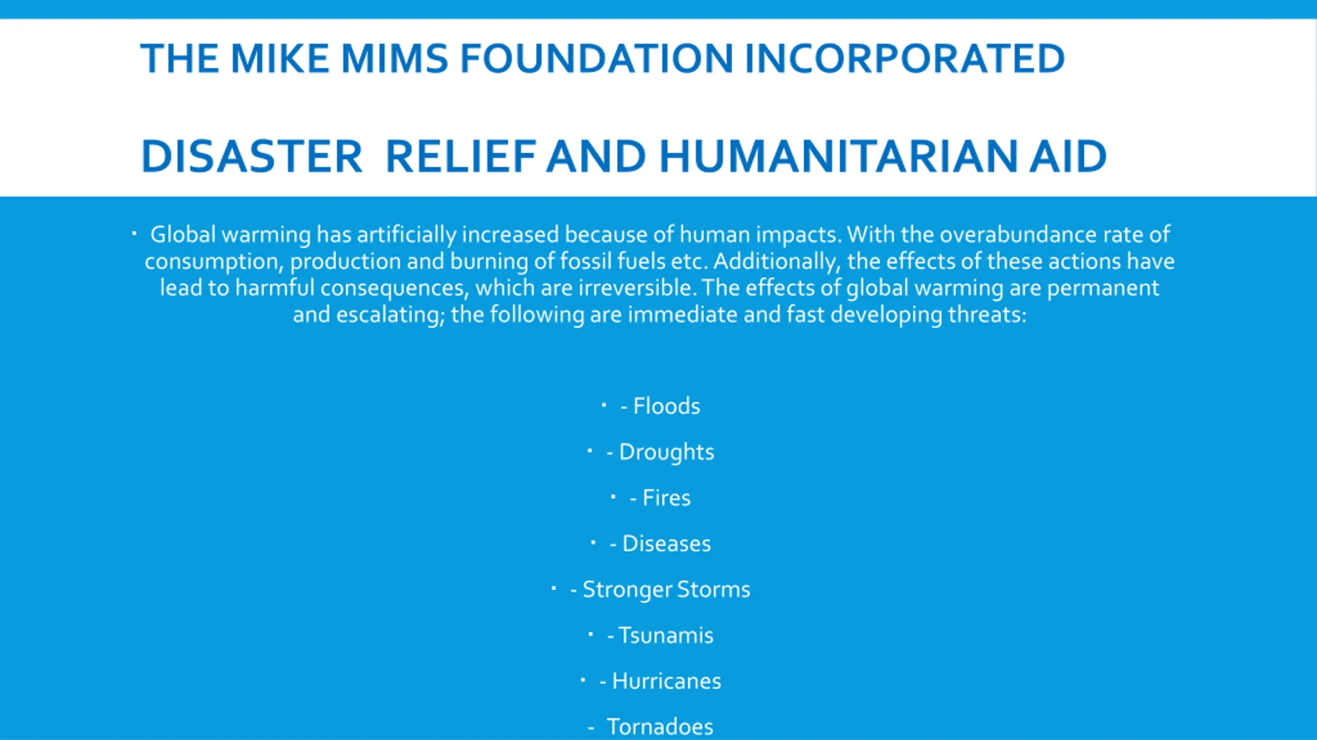 THE MIKE MIMS FOUNDATION INCORPORATED DISASTER RELIEF AND HUMANITARIAN AID Global warming has artificially increased because of human impacts. With the overabundance rate of consumption, production and burning of fossil fuels etc. Additionally, the effects of these actions have lead to harmful consequences, which are irreversible. The effects of global warming are permanent and escalating; the following are immediate and fast developing threats: - Floods - Droughts - Fires - Diseases -Stronger Storms -Tsunamis - Hurricanes - Tornadoes