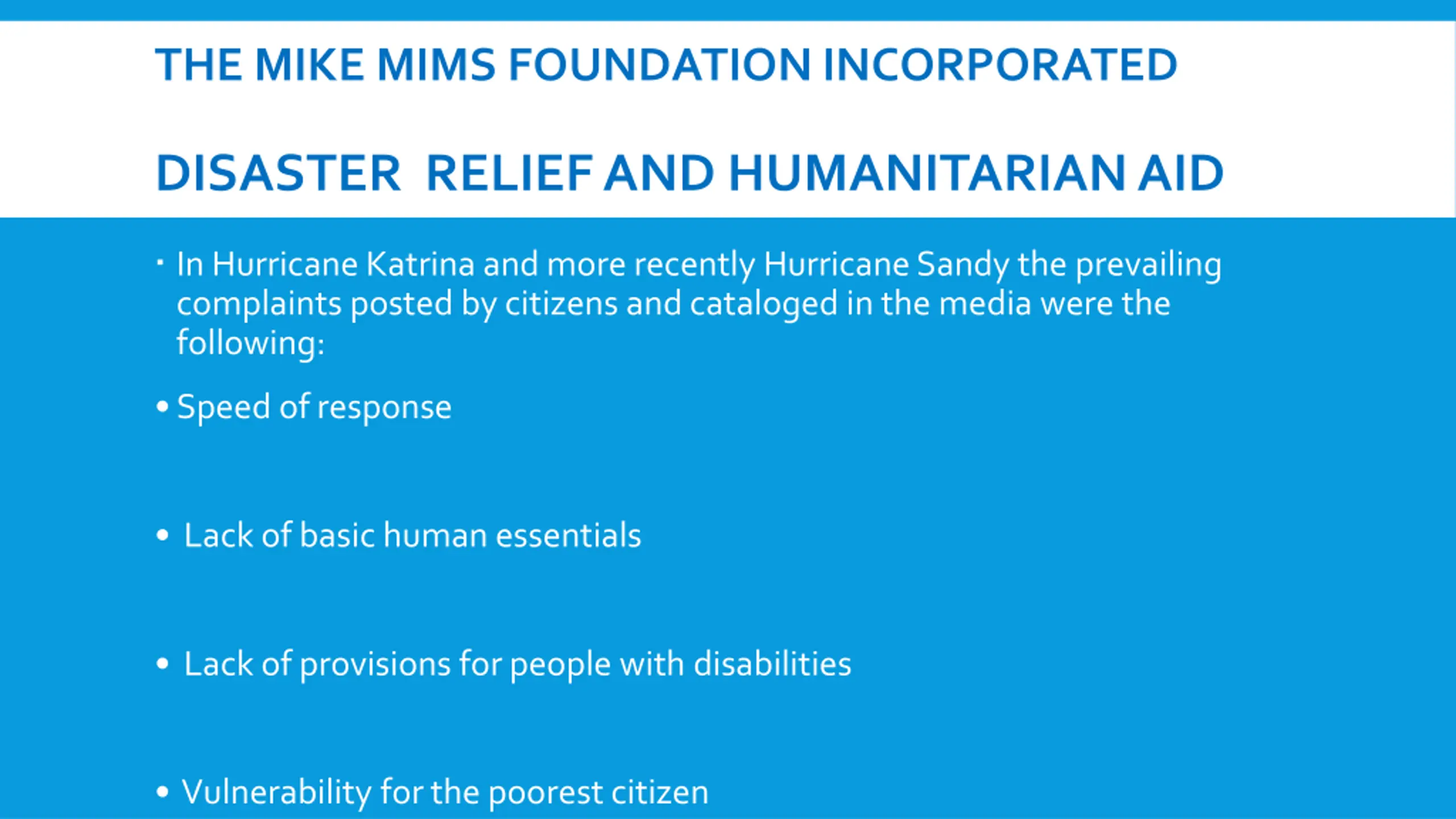THE MIKE MIMS FOUNDATION INCORPORATED DISASTER RELIEF AND HUMANITARIAN AID In Hurricane Katrina and more recently Hurricane Sandy the prevailing complaints posted by citizens and cataloged in the media were the following: Speed of response Lack of basic human essentials Lack of provisions for people with disabilities Vulnerability for the poorest citizen