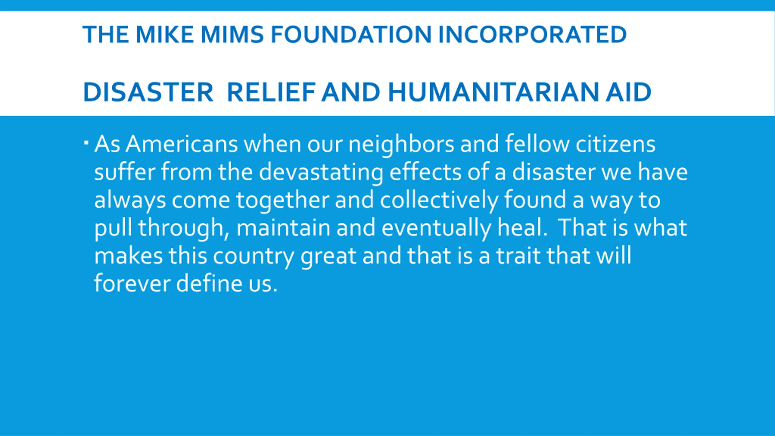 THE MIKE MIMS FOUNDATION INCORPORATED DISASTER RELIEF AND HUMANITARIAN AID As Americans when our neighbors and fellow citizens suffer from the devastating effects of a disaster we have always come together and collectively found a way to pull through, maintain and eventually heal. That is what makes this country great and that is a trait that will forever define us.