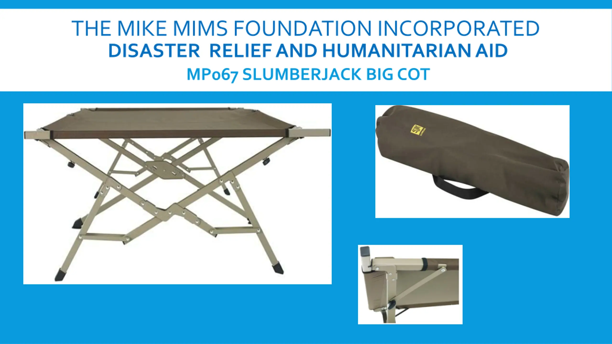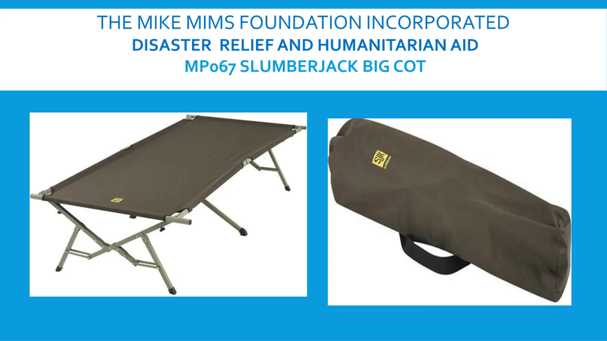 THE MIKE MIMS FOUNDATION INCORPORATED DISASTER RELIEF AND HUMANITARIAN AID MP067 SLUMBERJACK BIG COT