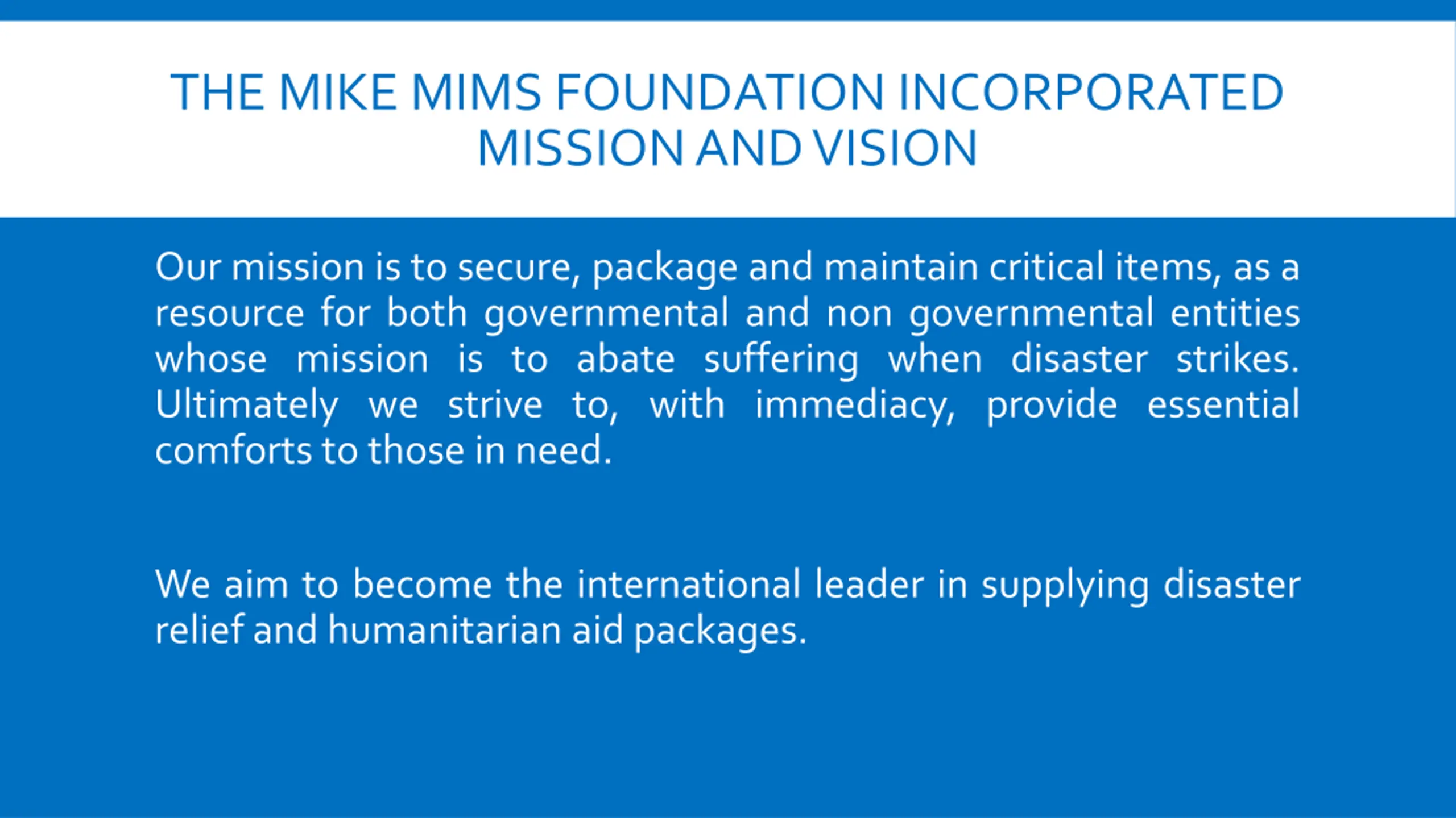 THE MIKE MIMS FOUNDATION INCORPORATED MISSION AND VISION Our mission is to secure, package and maintain critical items, as a resource for both governmental and non governmental entities whose mission is to abate suffering when disaster strikes. Ultimately we strive to, with immediacy, provide essential comforts to those in need. We aim to become the international leader in supplying disaster relief and humanitarian aid packages.