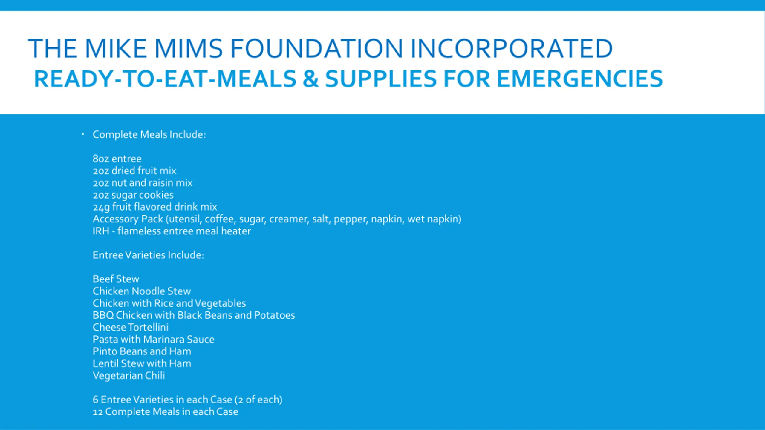 THE MIKE MIMS FOUNDATION INCORPORATED READY-TO-EAT-MEALS & SUPPLIES FOR EMERGENCIES Complete Meals Include: 8oz entree 2oz dried fruit mix 2oz nut and raisin mix 2oz sugar cookies 24g fruit flavored drink mix Accessory Pack (utensil, coffee, sugar, creamer, salt, pepper, napkin, wet napkin) IRH-flameless entree meal heater Entree Varieties Include: Beef Stew Chicken Noodle Stew Chicken with Rice and Vegetables BBQChicken with Black Beans and Potatoes Cheese Tortellini Pasta with Marinara Sauce Pinto Beans and Ham Lentil Stew with Ham Vegetarian Chili 6 Entree Varieties in each Case (2 of each) 12 Complete Meals in each Case