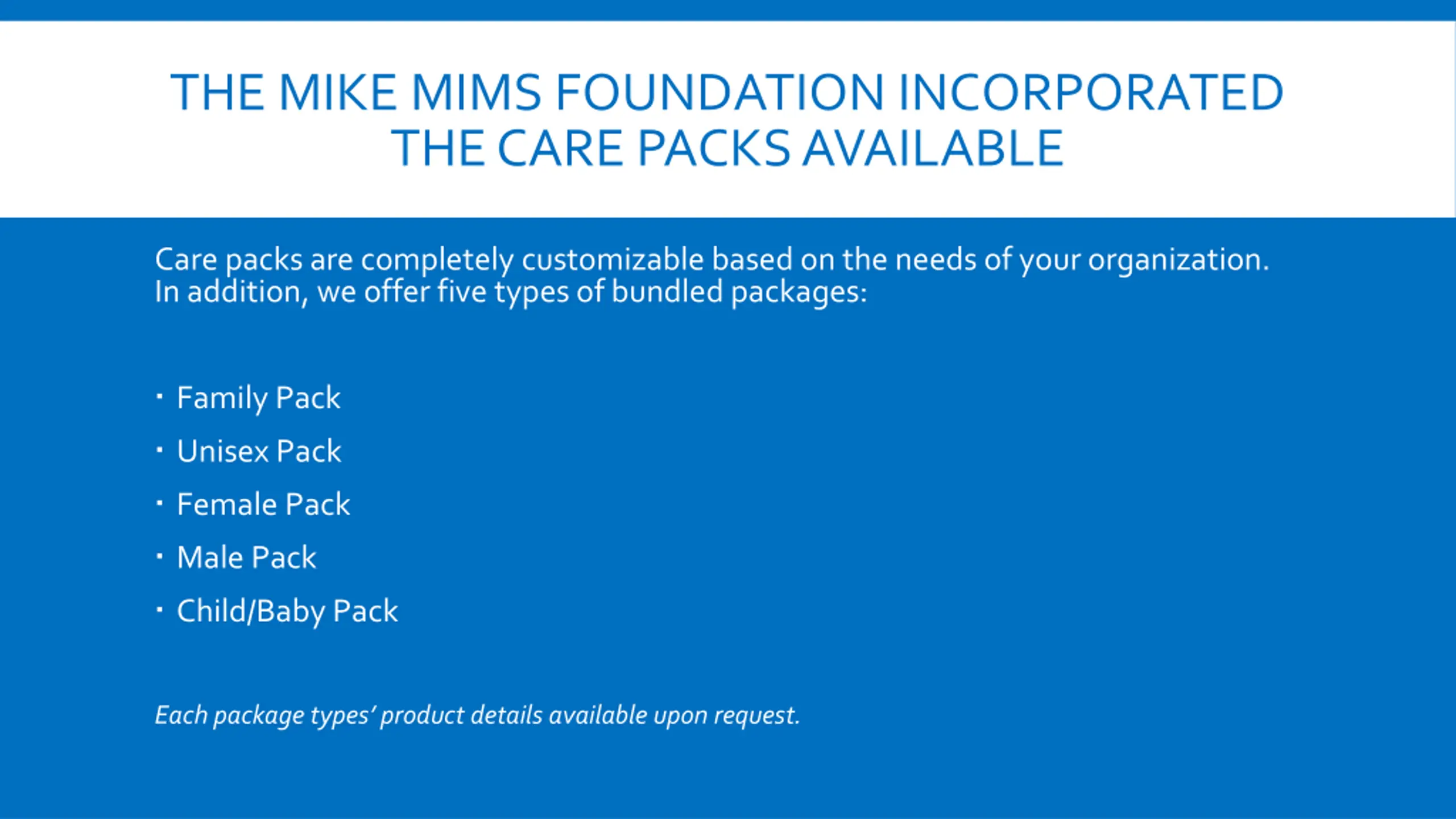 THE MIKE MIMS FOUNDATION INCORPORATED THE CARE PACKS AVAILABLE Care packs are completely customizable based on the needs of your organization. In addition, we offer five types of bundled packages: Family Pack Unisex Pack Female Pack Male Pack Child/Baby Pack Each package types product details available upon request.
