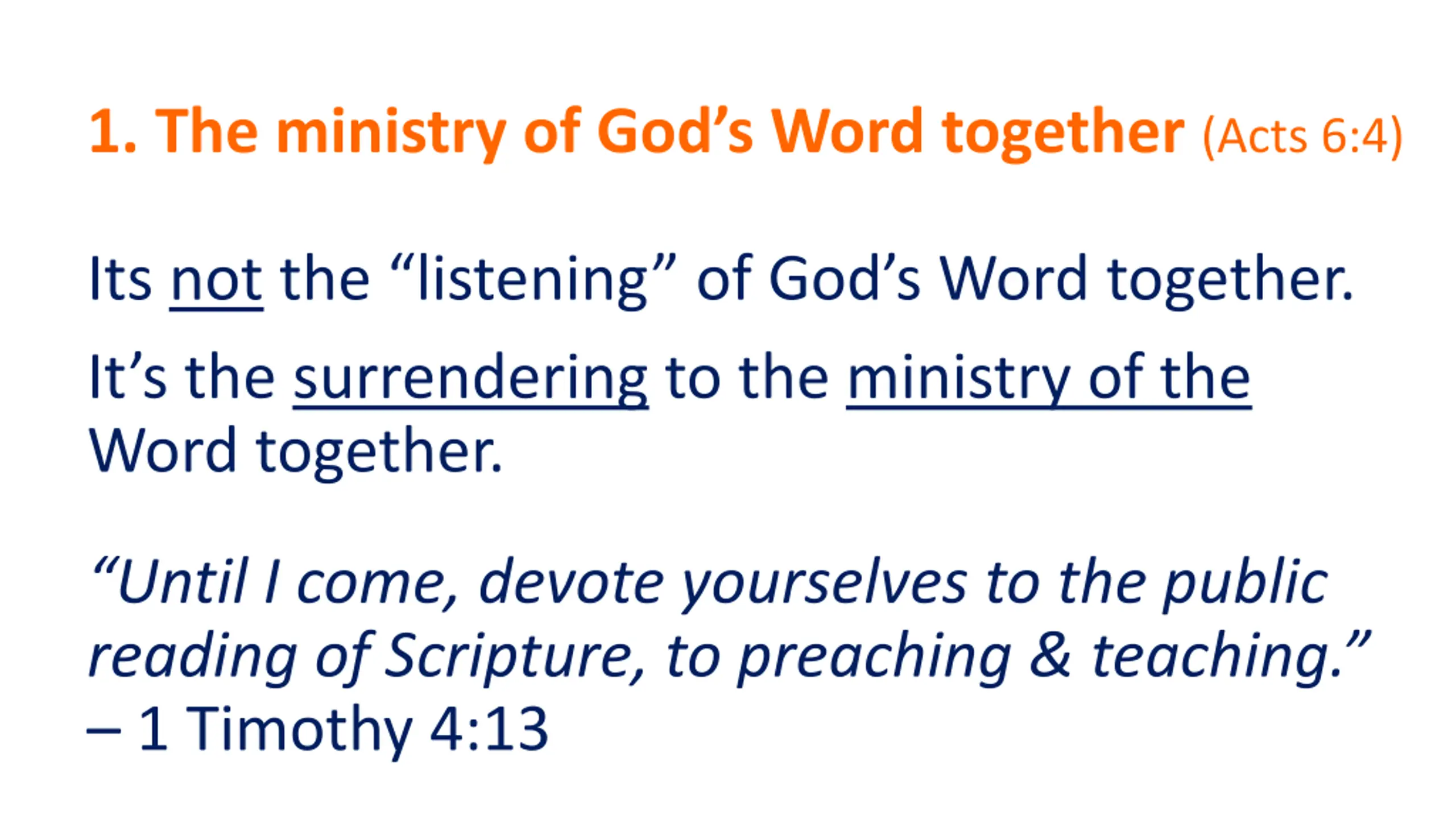 1. The ministry of Gods Word together (Acts 6:4) Its not the listening of God s Word together. It s the surrendering to the ministry of the Word together. Until I come, devote yourselves to the public reading of Scripture, to preaching & teaching. 1 Timothy 4:13