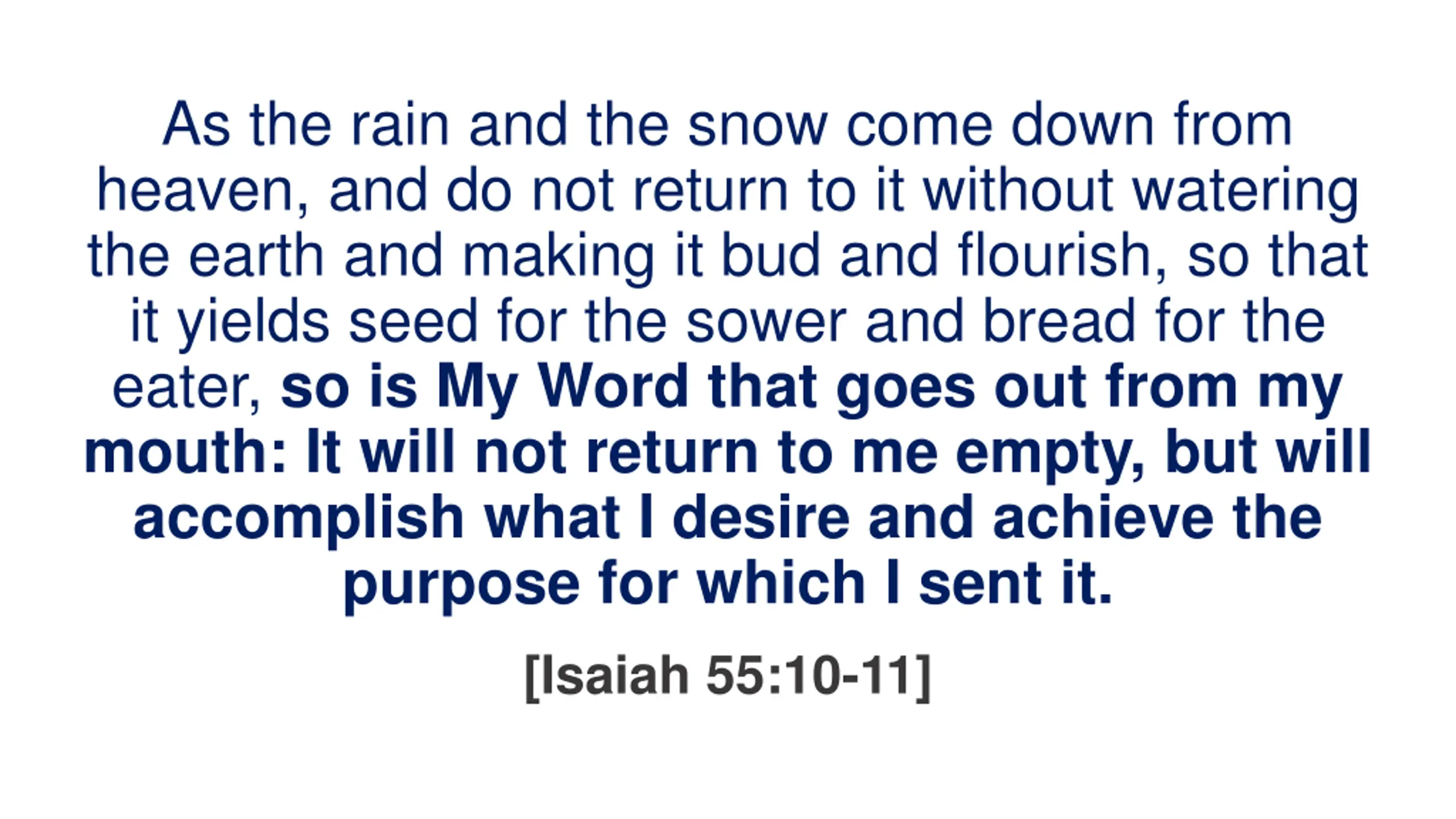 As the rain and the snow come down from heaven, and do not return to it without watering the earth and making it bud and flourish, so that it yields seed for the sower and bread for the eater, so is My Word that goes out from my mouth: It will not return to me empty, but will accomplish what I desire and achieve the purpose for which I sent it. [Isaiah 55:10-11]