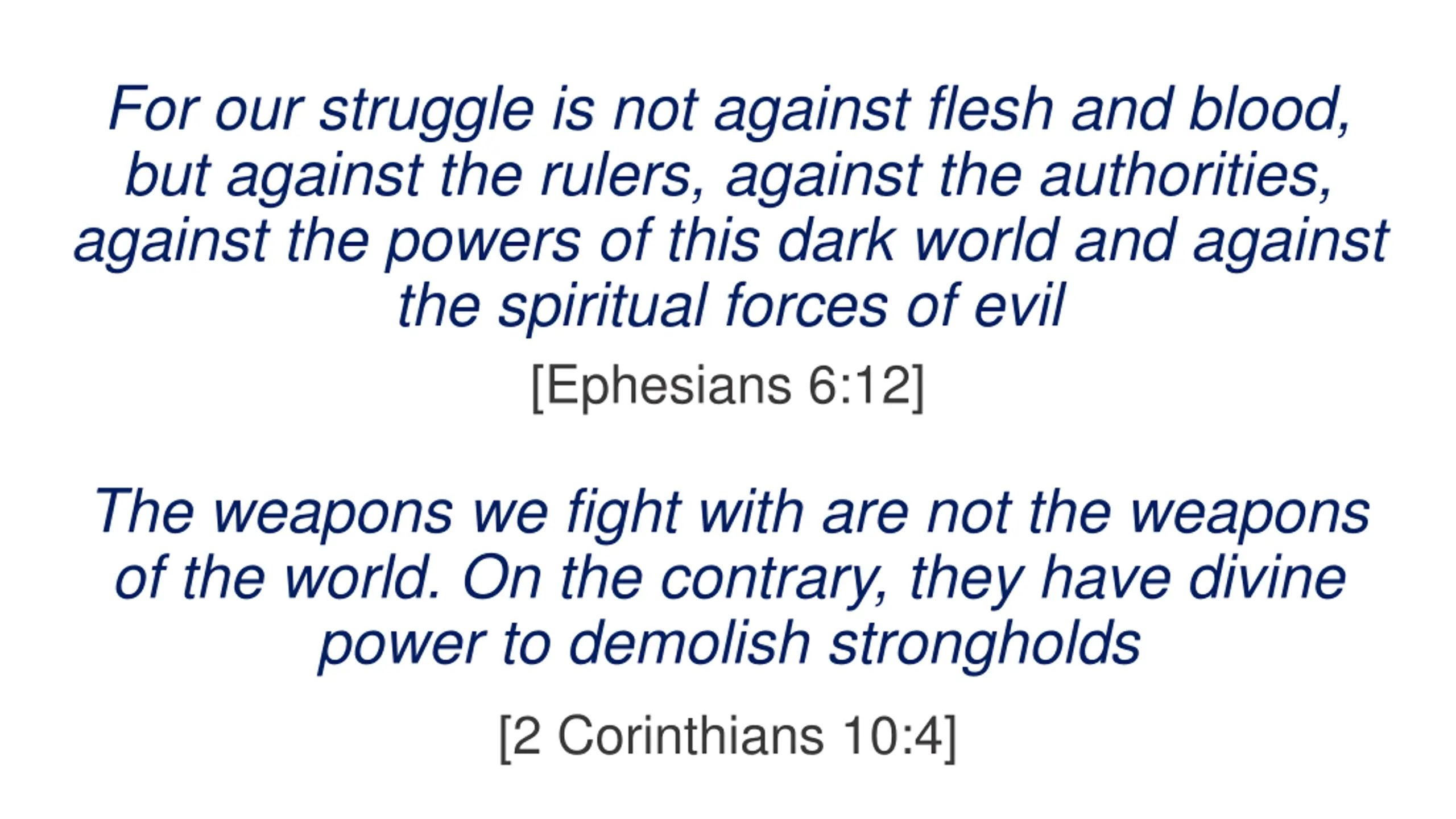 For our struggle is not against flesh and blood, but against the rulers, against the authorities, against the powers of this dark world and against the spiritual forces of evil [Ephesians 6:12] The weapons we fight with are not the weapons of the world. On the contrary, they have divine power to demolish strongholds [2 Corinthians 10:4]