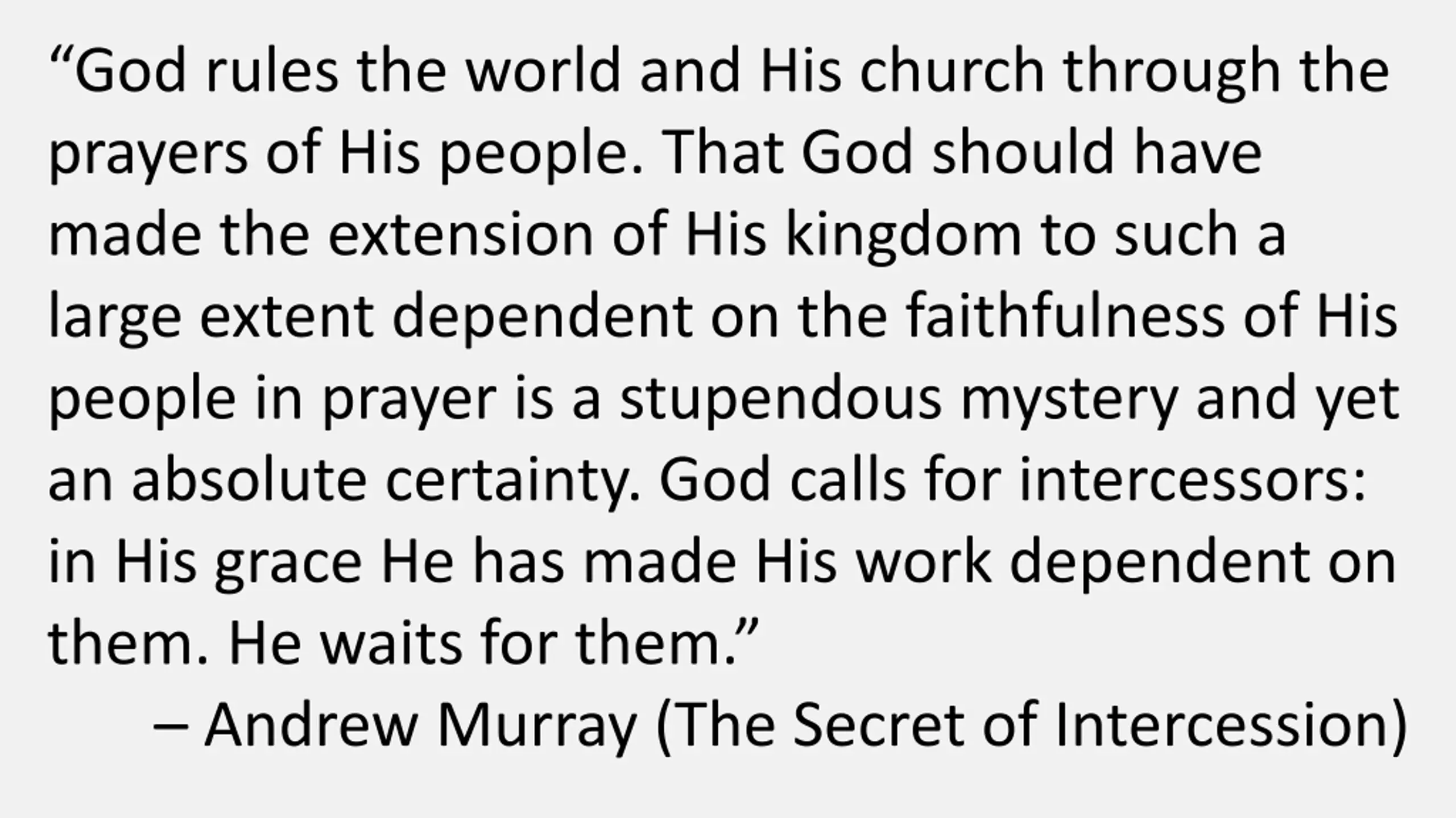 God rules the world and His church through the prayers of His people. That God should have made the extension of His kingdom to such a large extent dependent on the faithfulness of His people in prayer is a stupendous mystery and yet an absolute certainty. God calls for intercessors: in His grace He has made His work dependent on them. He waits for them. Andrew Murray (The Secret of Intercession)