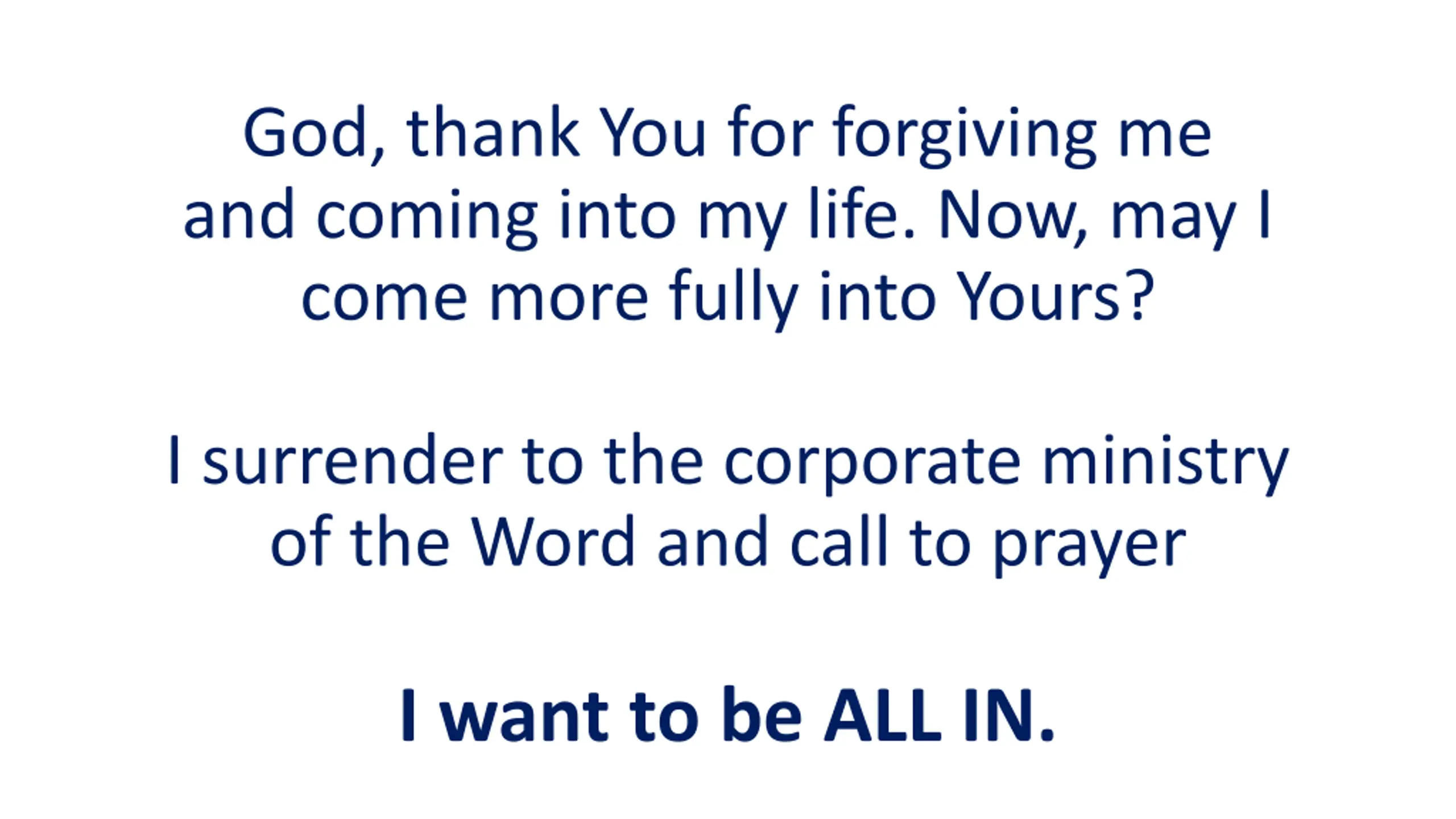 God, thank You for forgiving me and coming into my life. Now, may I come more fully into Yours? I surrender to the corporate ministry of the Word and call to prayer I want to be ALL IN.