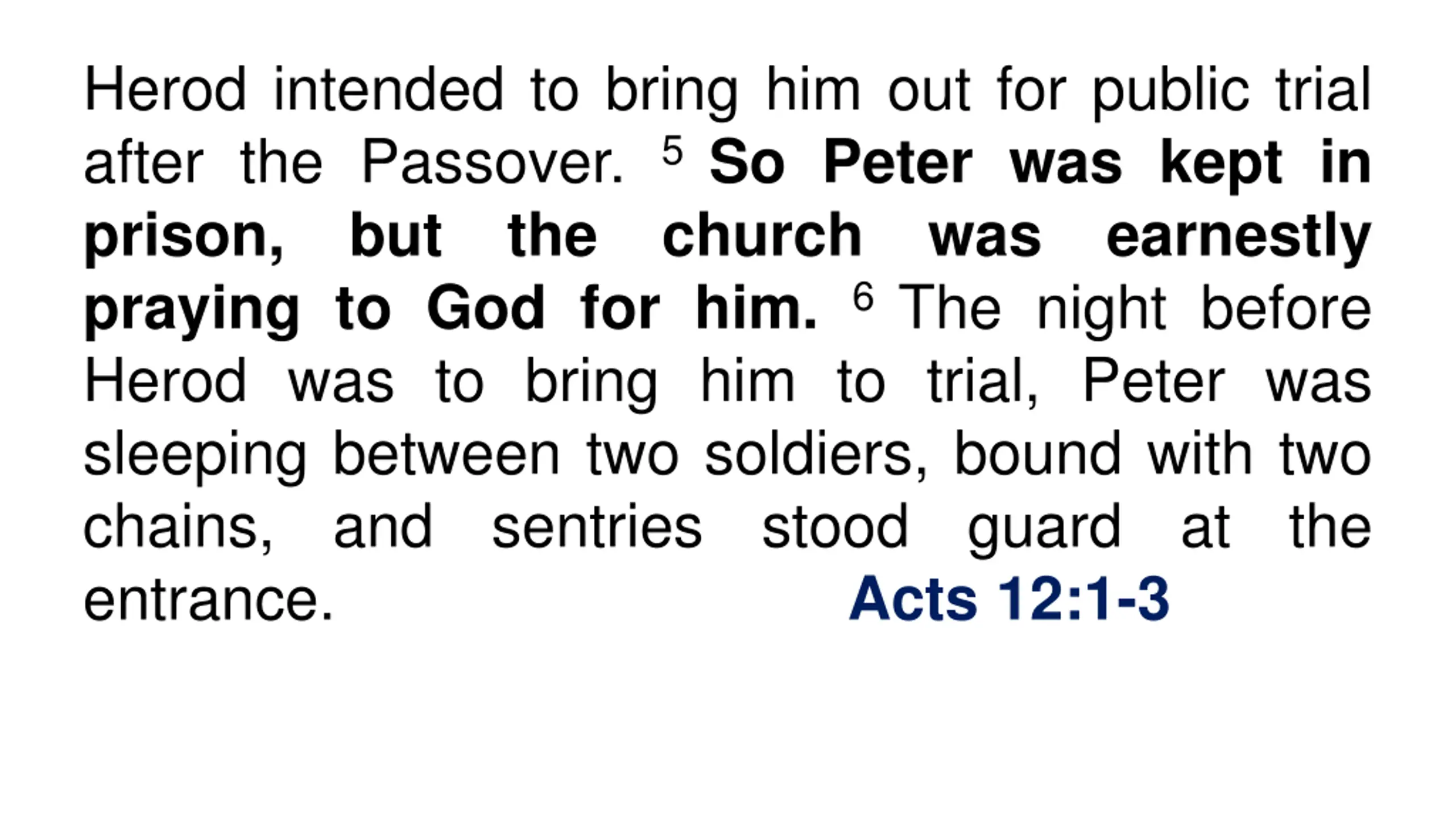 Herod intended to bring him out for public trial after the Passover. prison, but the church was earnestly praying to God for him. Herod was to bring him to trial, Peter was sleeping between two soldiers, bound with two chains, and sentries stood guard at the entrance. 5 So Peter was kept in 6 The night before Acts 12:1-3