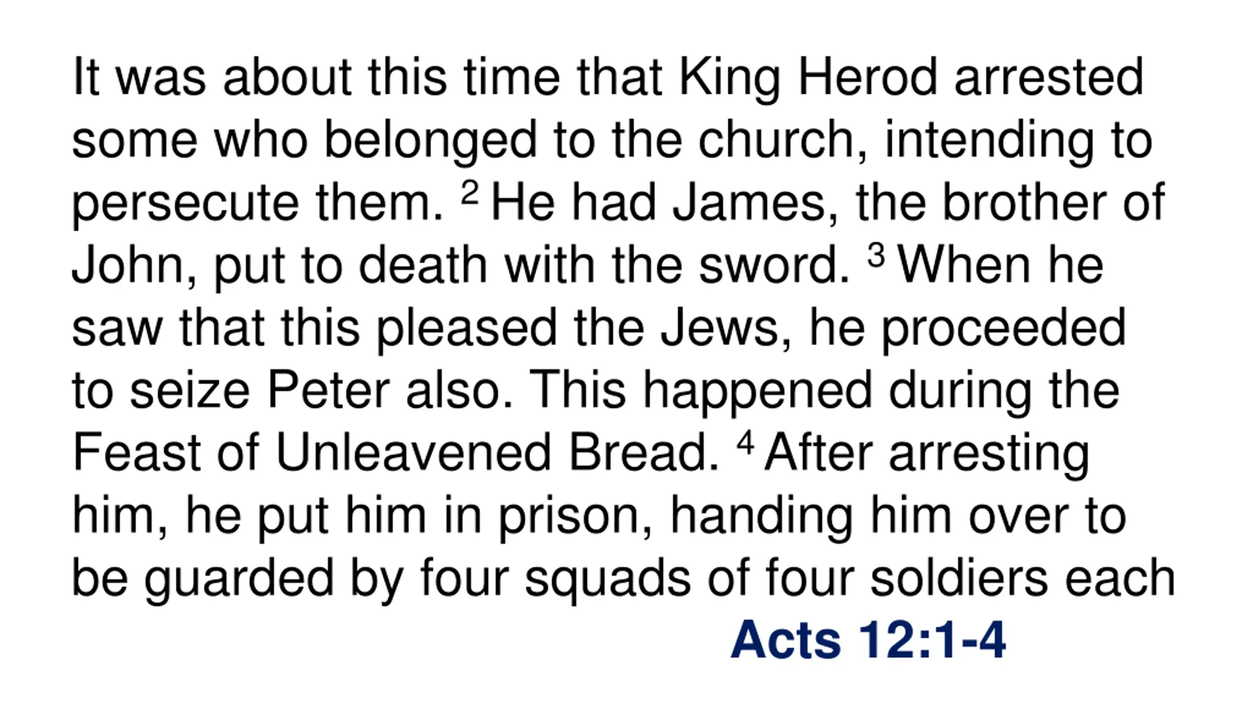 It was about this time that King Herod arrested some who belonged to the church, intending to persecute them. 2 He had James, the brother of John, put to death with the sword. 3 When he saw that this pleased the Jews, he proceeded to seize Peter also. This happened during the Feast of Unleavened Bread. 4 After arresting him, he put him in prison, handing him over to be guarded by four squads of four soldiers each Acts 12:1-4