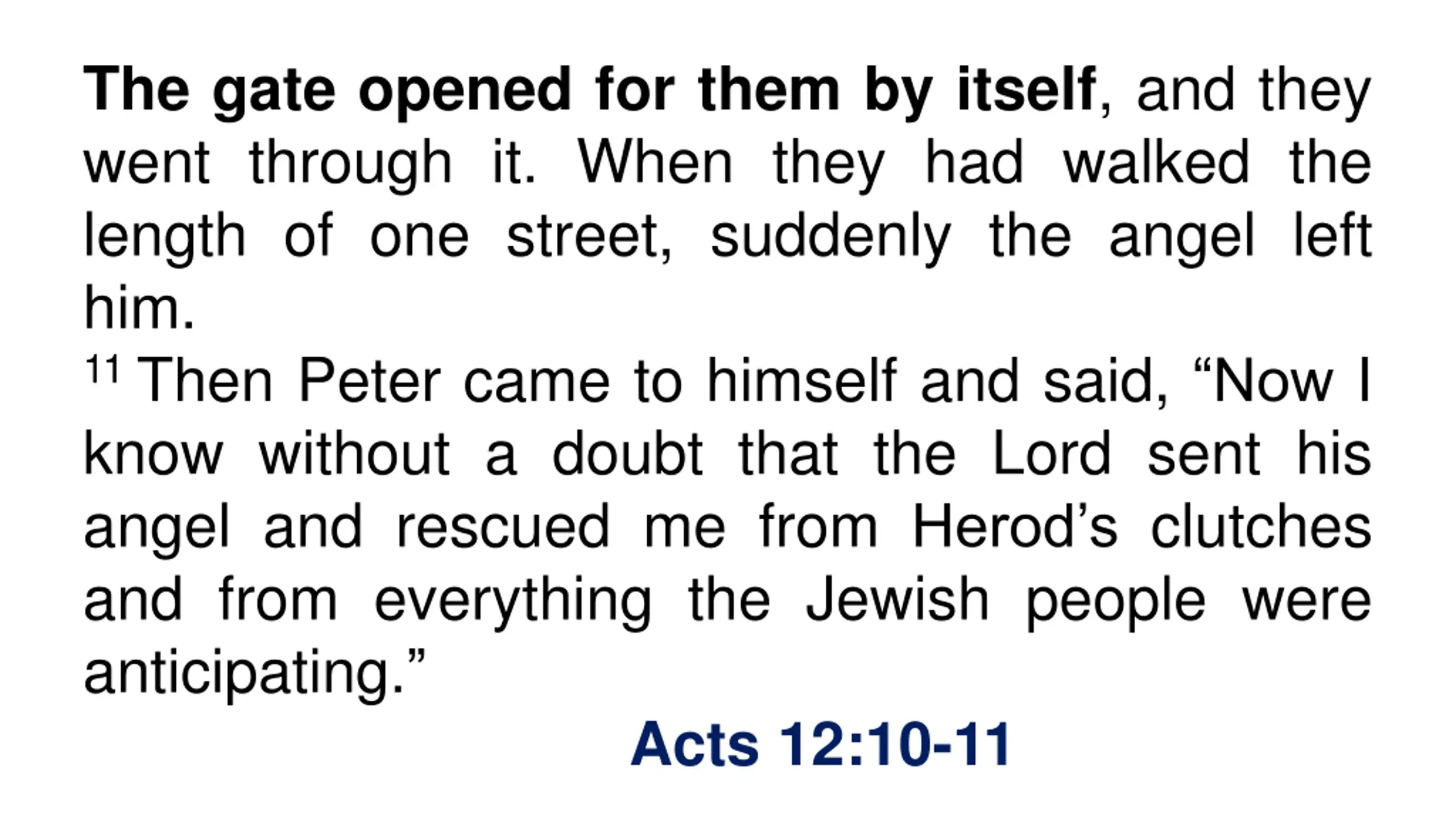 The gate opened for them by itself, and they went through it. When they had walked the length of one street, suddenly the angel left him. 11 Then Peter came to himself and said, Now I know without a doubt that the Lord sent his angel and rescued me from Herod s clutches and from everything the Jewish people were anticipating. Acts 12:10-11