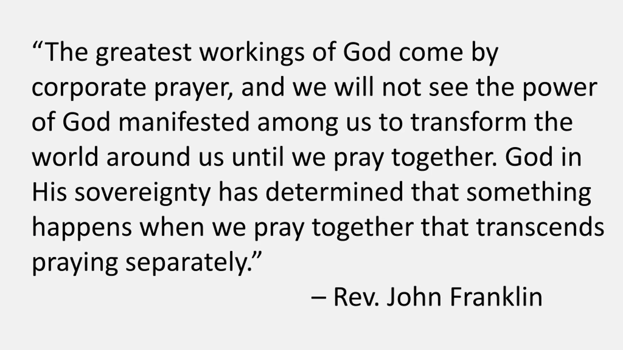 The greatest workings of God come by corporate prayer, and we will not see the power of God manifested among us to transform the world around us until we pray together. God in His sovereignty has determined that something happens when we pray together that transcends praying separately. Rev. John Franklin