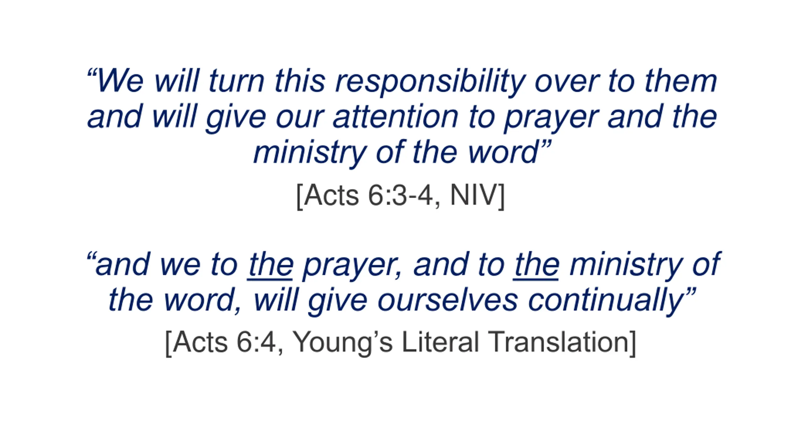 We will turn this responsibility over to them and will give our attention to prayer and the ministry of the word [Acts 6:3-4, NIV] and we to the prayer, and to the ministry of the word, will give ourselves continually [Acts 6:4, Young s Literal Translation]