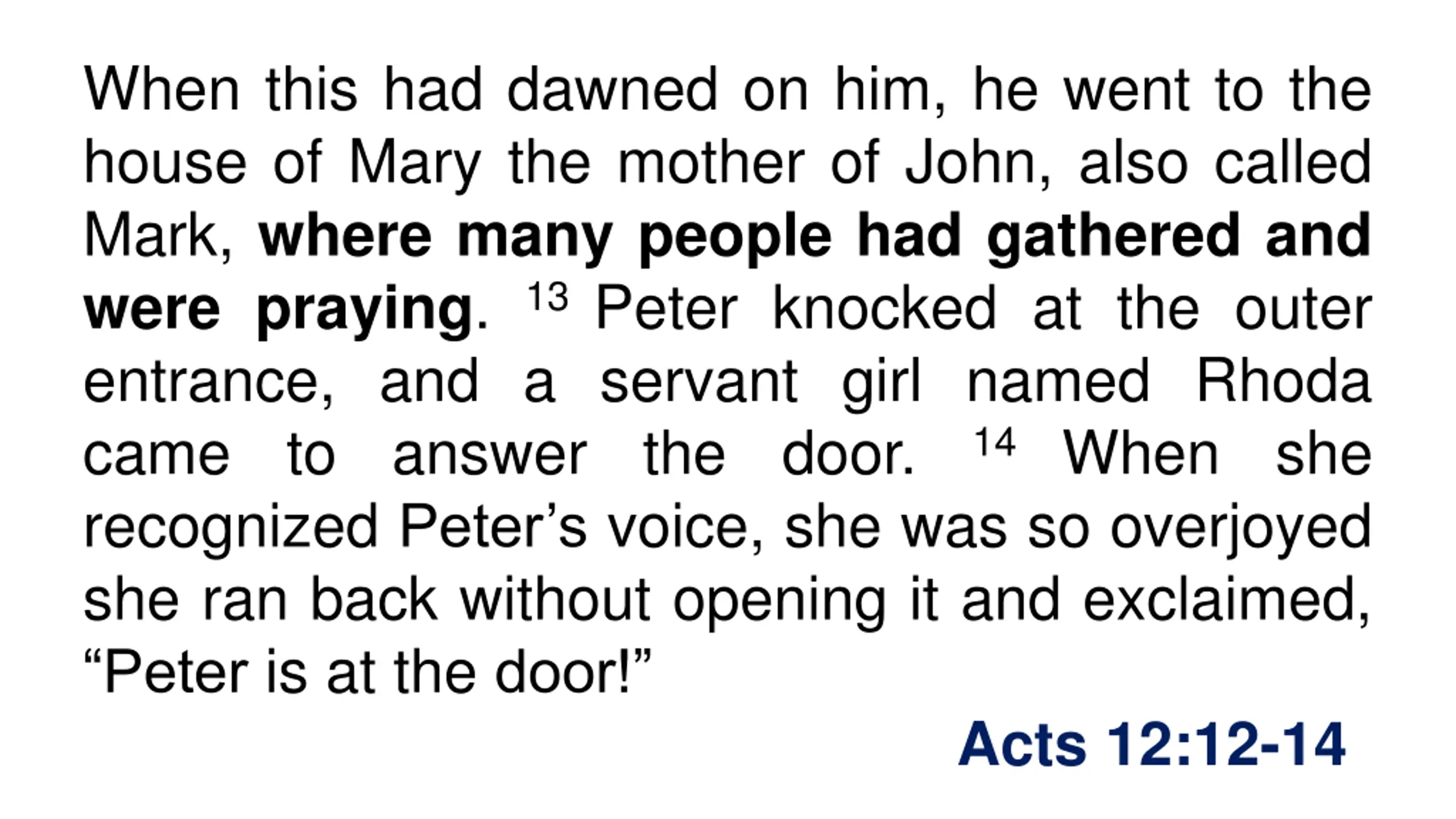When this had dawned on him, he went to the house of Mary the mother of John, also called Mark, where many people had gathered and were praying. 13 Peter knocked at the outer entrance, and a servant girl named Rhoda came to answer the door. recognized Peter s voice, she was so overjoyed she ran back without opening it and exclaimed, Peter is at the door! 14 When she Acts 12:12-14