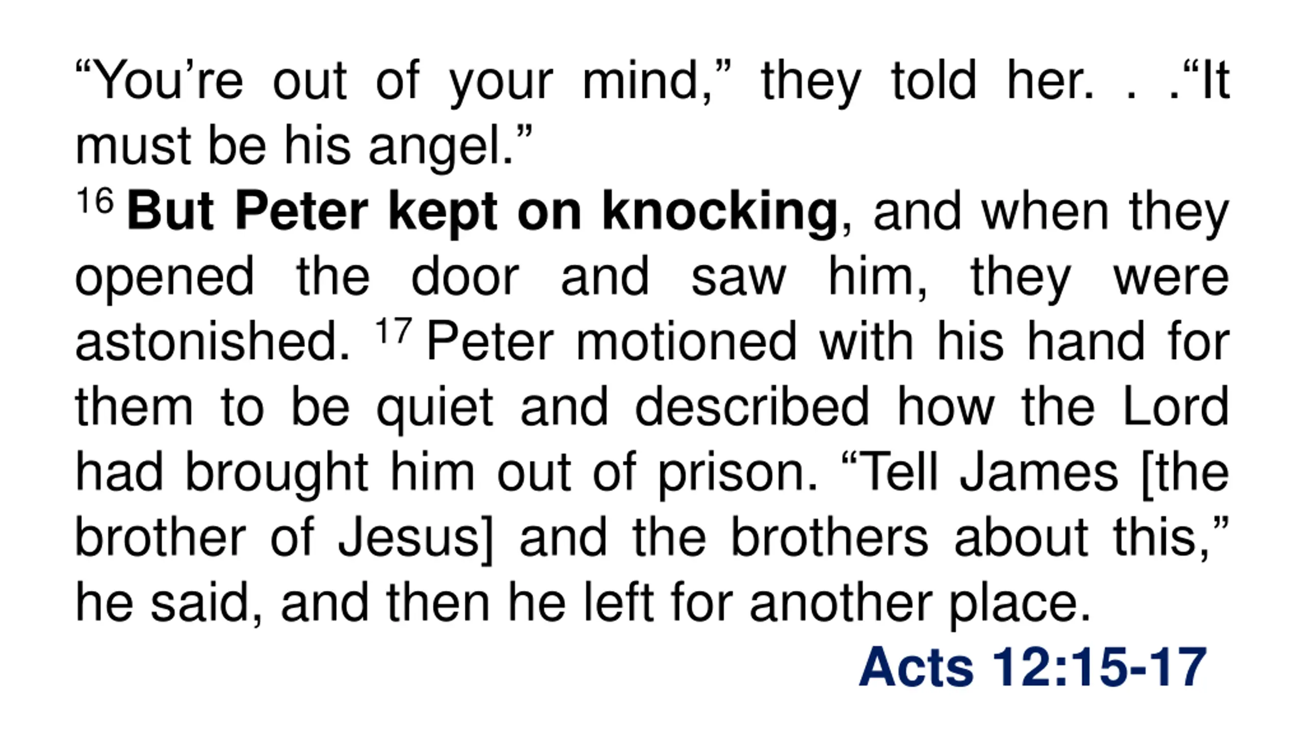 Youre out of your mind, they told her. . .It must be his angel. 16 But Peter kept on knocking, and when they opened the door and saw him, they were astonished. 17 Peter motioned with his hand for them to be quiet and described how the Lord had brought him out of prison. Tell James [the brother of Jesus] and the brothers about this, he said, and then he left for another place. Acts 12:15-17