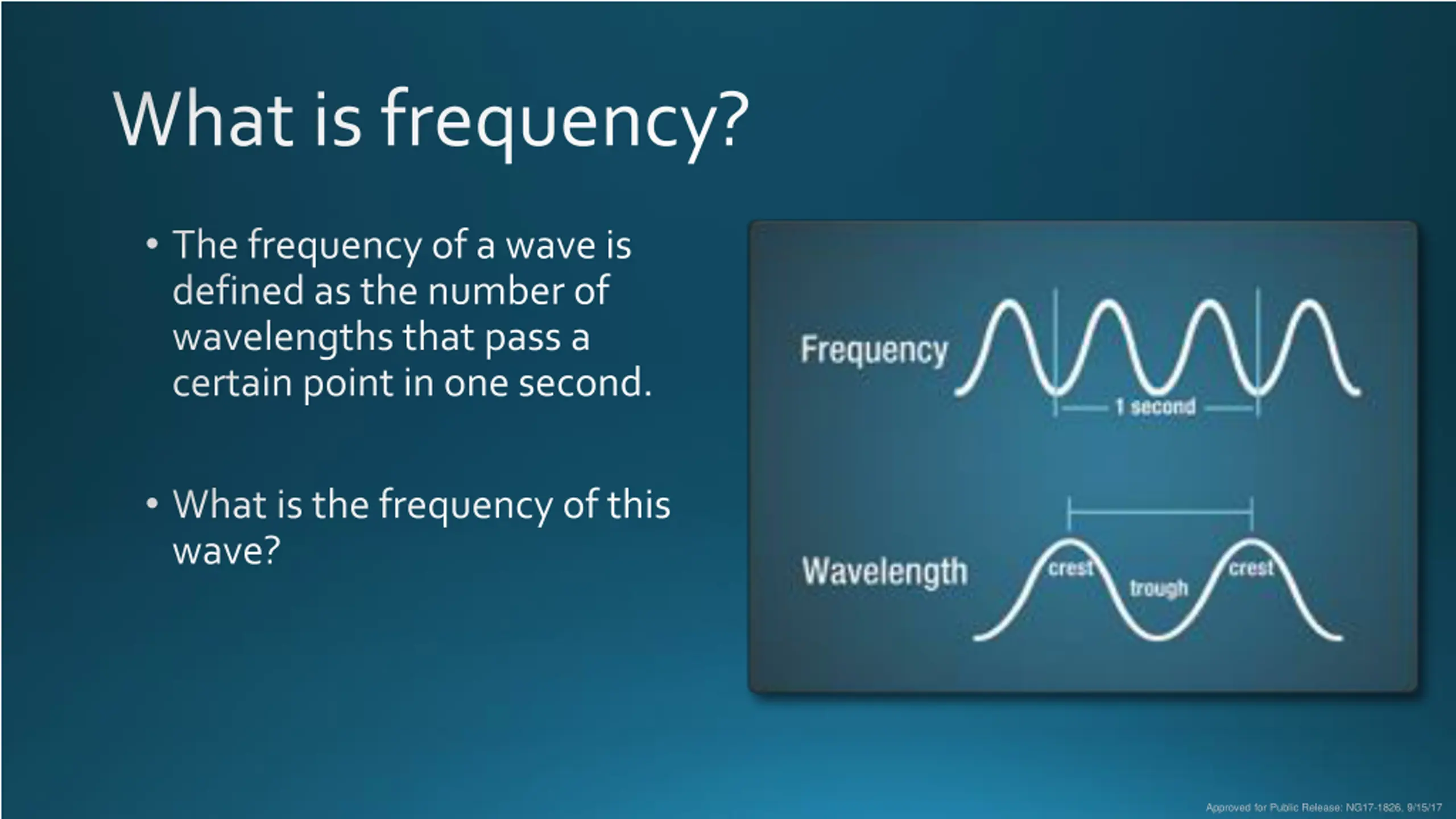 What is frequency? The frequency of a wave is defined as the number of wavelengths that pass a certain point in one second. What is the frequency of this wave? Approved for Public Release: NG17-1826, 9/15/17