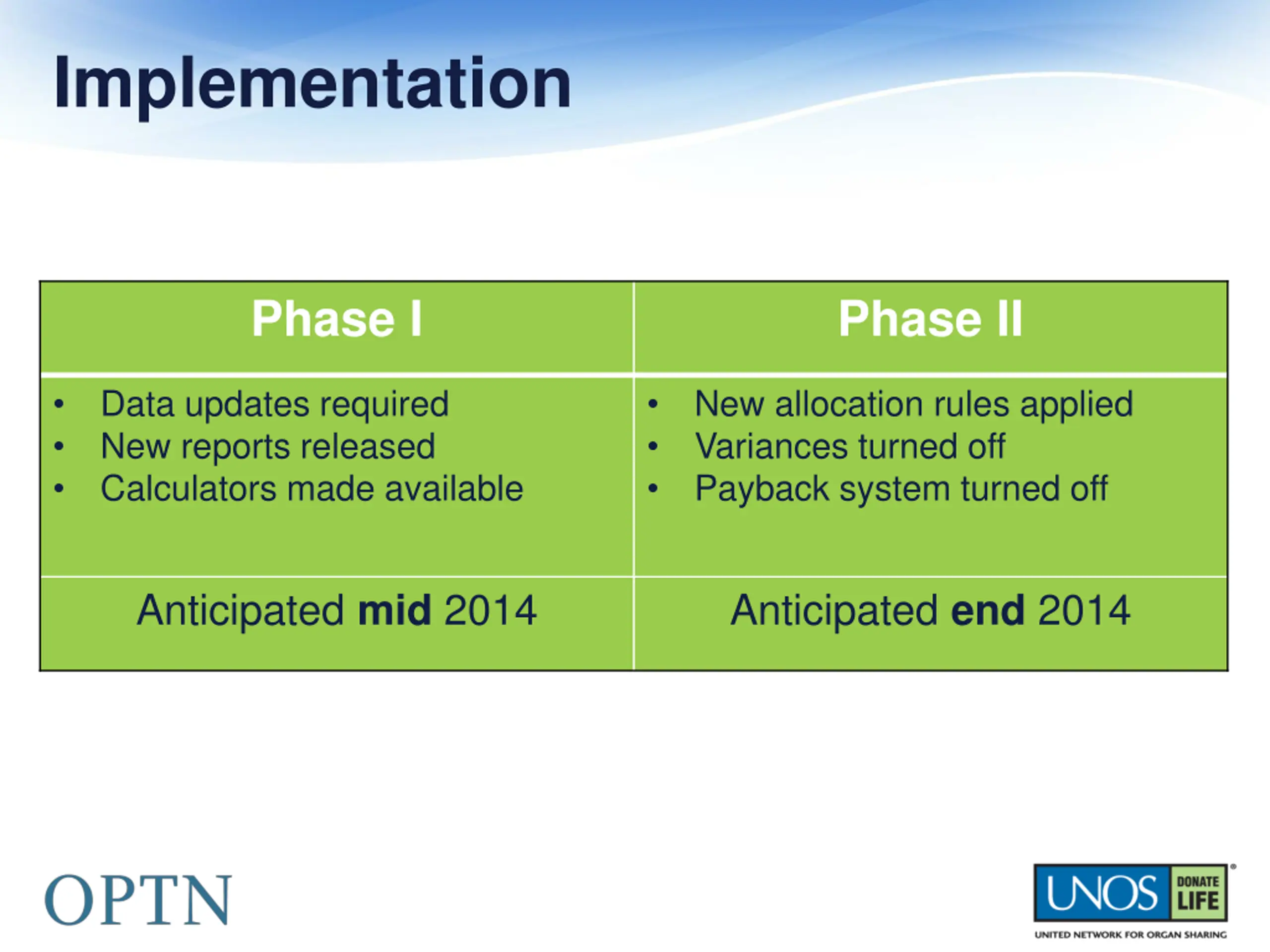 Implementation Phase I Phase II Data updates required New reports released Calculators made available New allocation rules applied Variances turned off Payback system turned off Anticipated mid 2014 Anticipated end 2014