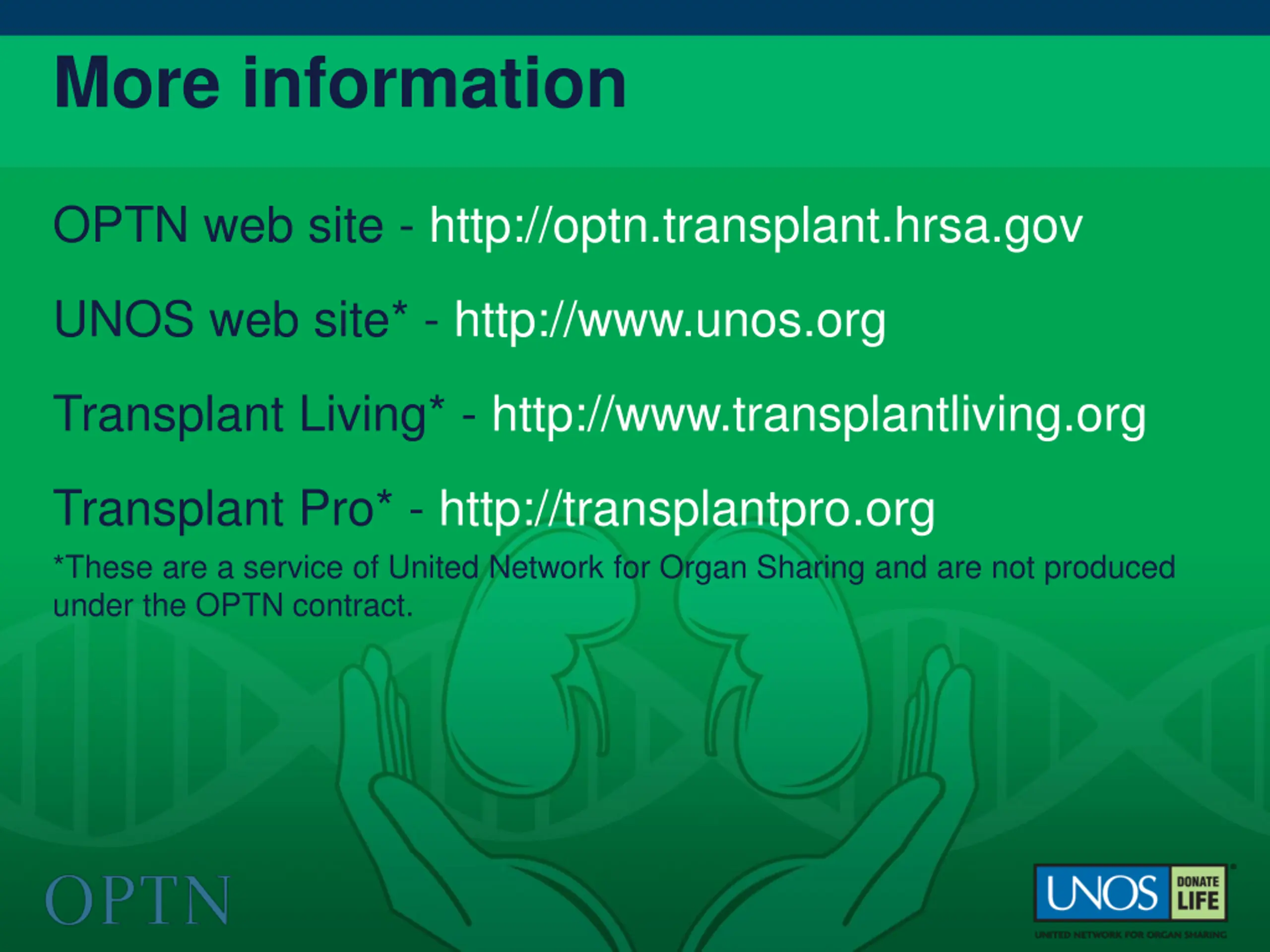 More information OPTN web site - http://optn.transplant.hrsa.gov UNOS web site* - http://www.unos.org Transplant Living* - http://www.transplantliving.org Transplant Pro* - http://transplantpro.org *These are a service of United Network for Organ Sharing and are not produced under the OPTN contract.