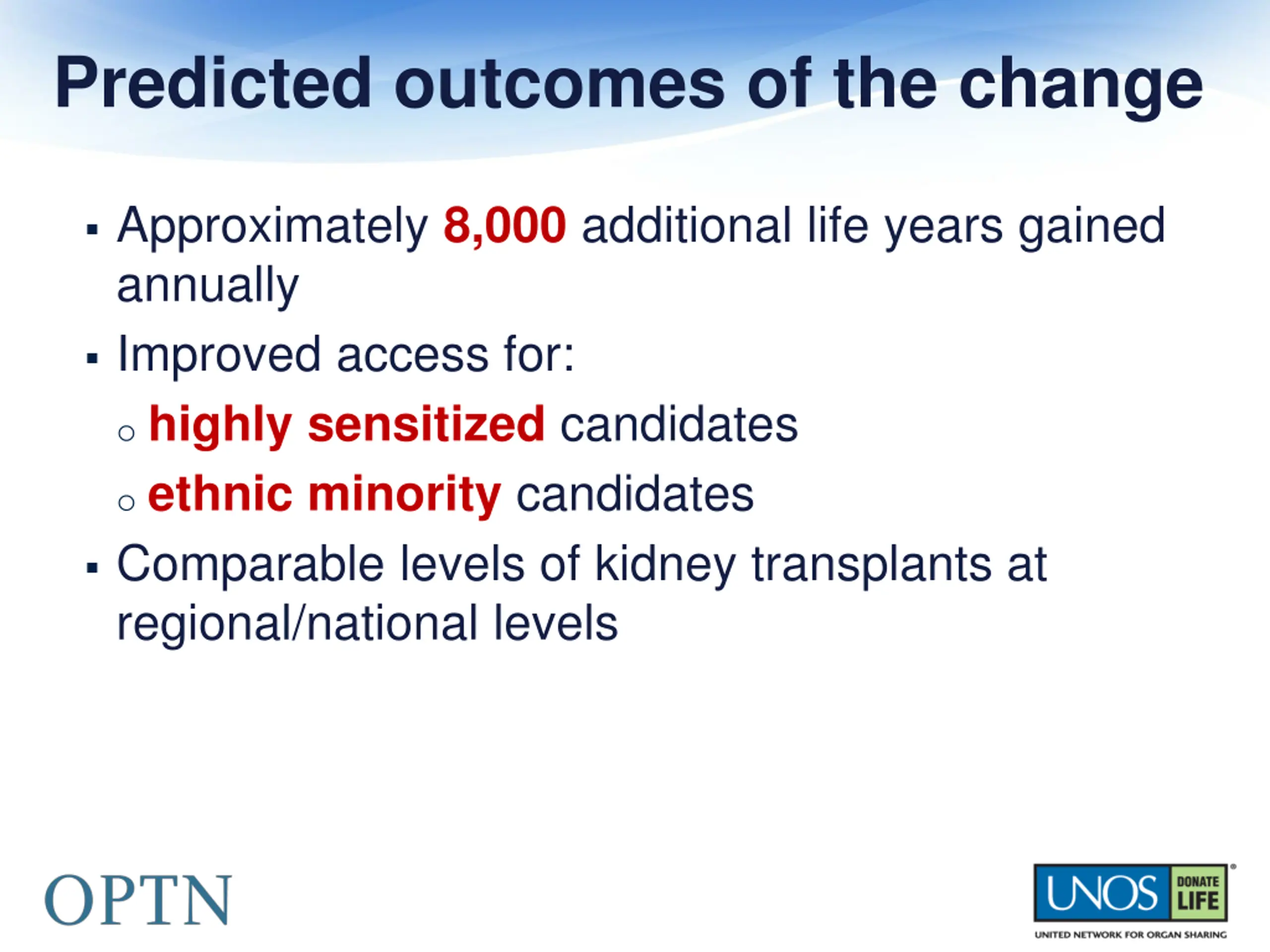 Predicted outcomes of the change Approximately 8,000 additional life years gained annually Improved access for: o highly sensitized candidates o ethnic minority candidates Comparable levels of kidney transplants at regional/national levels