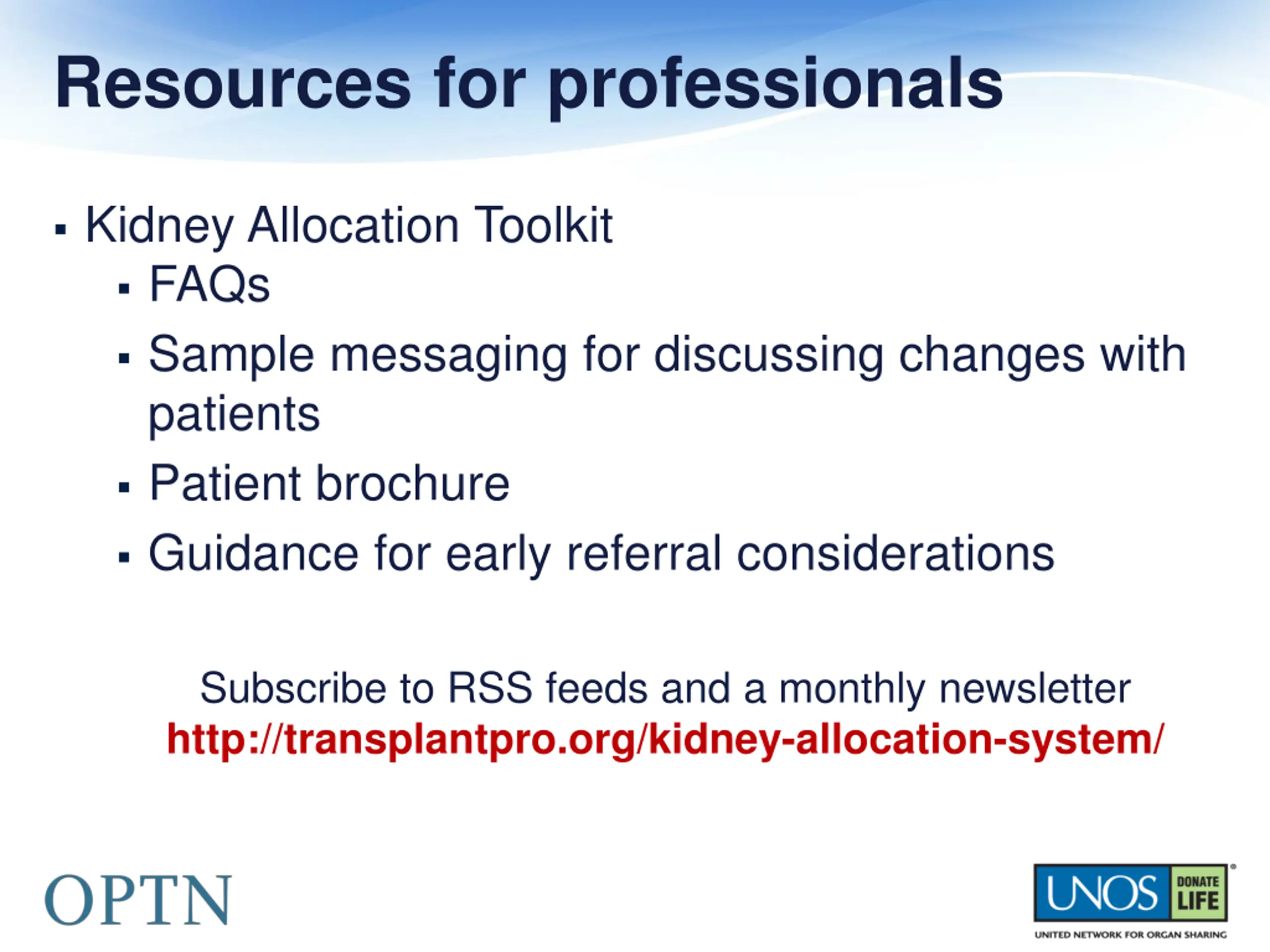 Resources for professionals Kidney Allocation Toolkit FAQs Sample messaging for discussing changes with patients Patient brochure Guidance for early referral considerations Subscribe to RSS feeds and a monthly newsletter http://transplantpro.org/kidney-allocation-system/