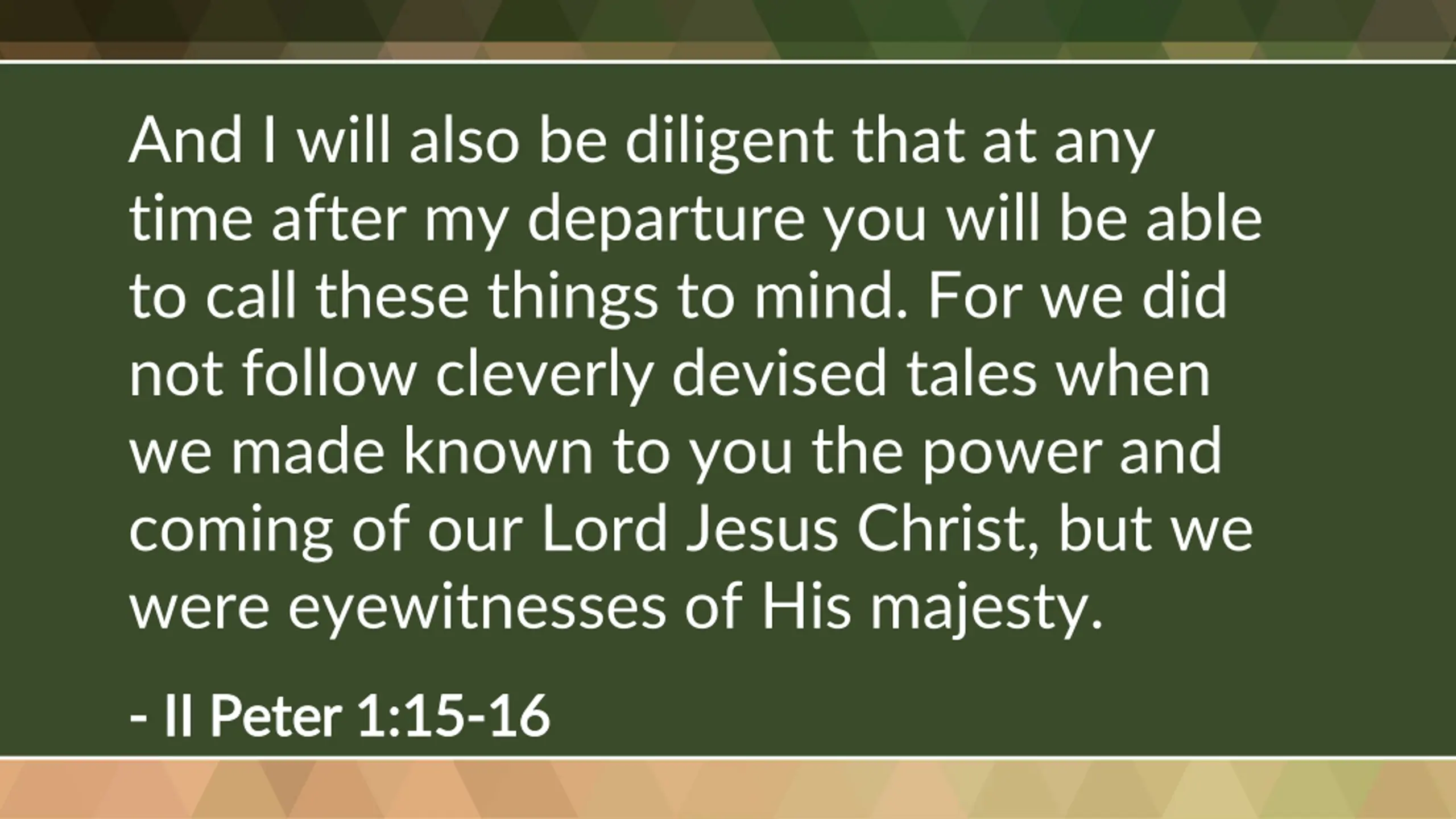 And I will also be diligent that at any time after my departure you will be able to call these things to mind. For we did not follow cleverly devised tales when we made known to you the power and coming of our Lord Jesus Christ, but we were eyewitnesses of His majesty. - - II Peter 1:15 II Peter 1:15- -16 16