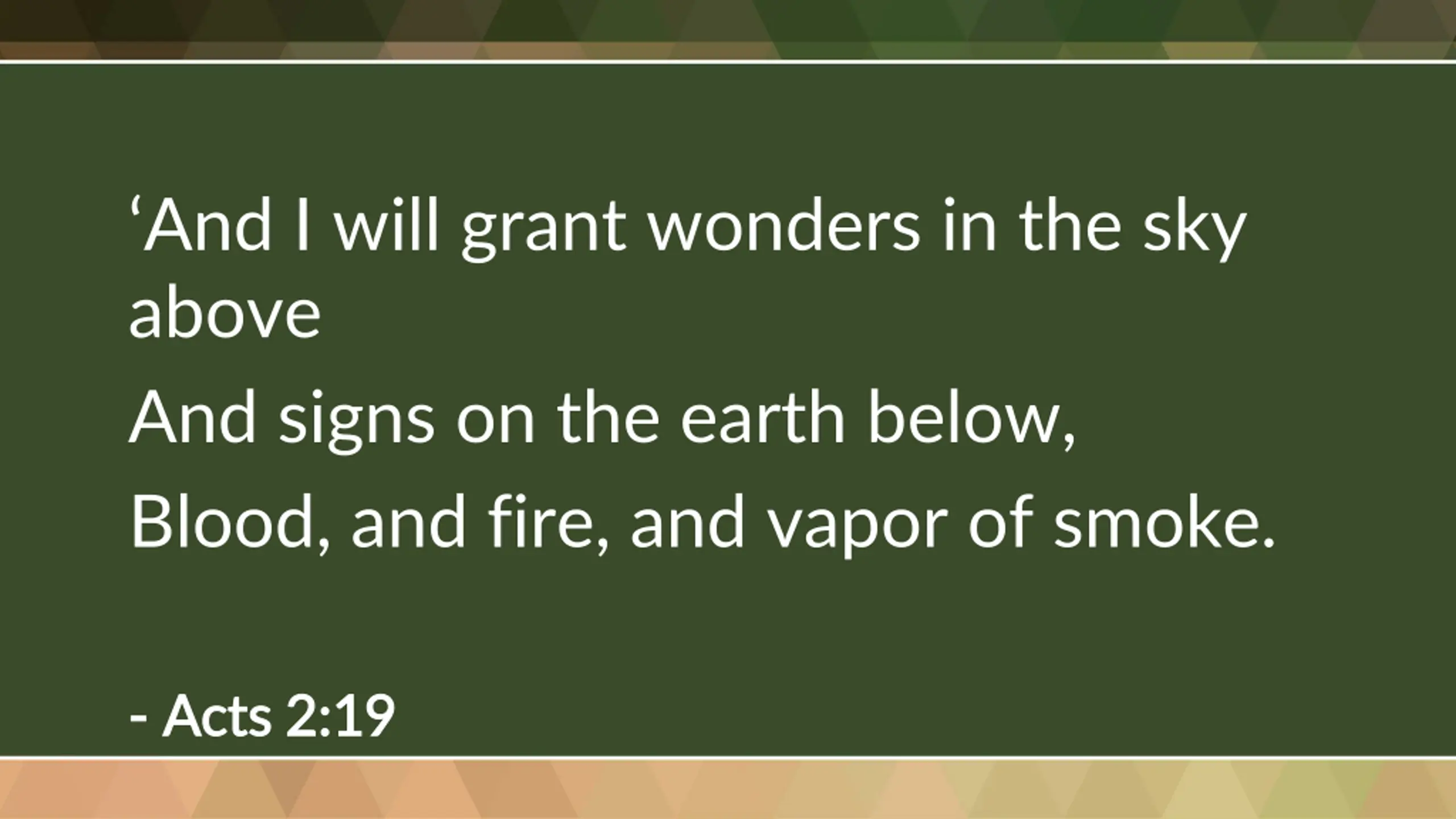And I will grant wonders in the sky above And signs on the earth below, Blood, and fire, and vapor of smoke. - - Acts 2:19 Acts 2:19