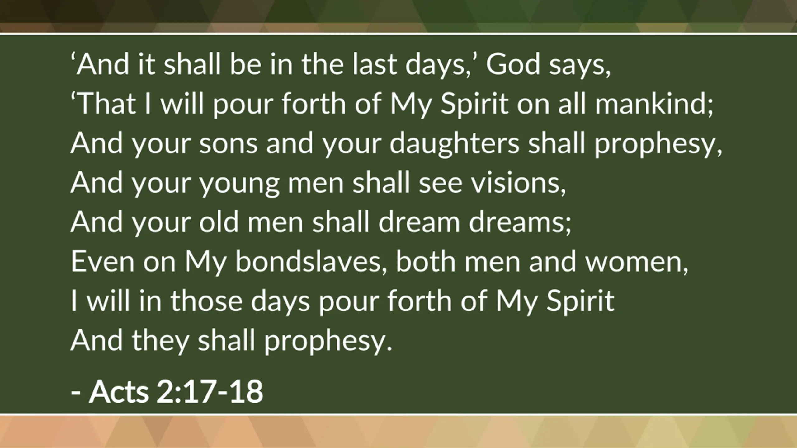 And it shall be in the last days, God says, That I will pour forth of My Spirit on all mankind; And your sons and your daughters shall prophesy, And your young men shall see visions, And your old men shall dream dreams; Even on My bondslaves, both men and women, I will in those days pour forth of My Spirit And they shall prophesy. - - Acts 2:17 Acts 2:17- -18 18