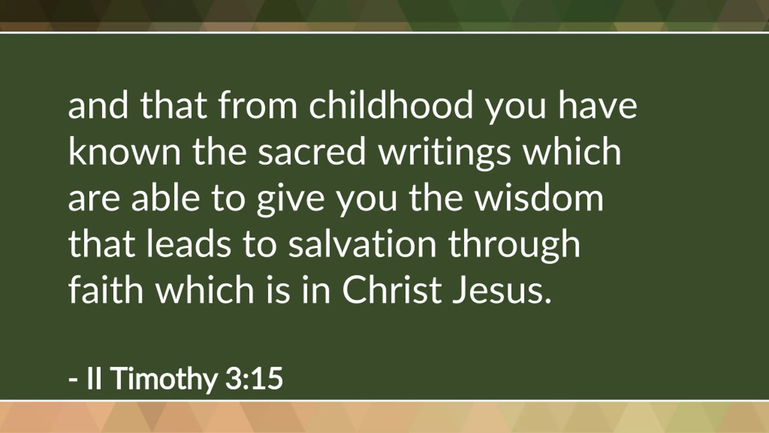 and that from childhood you have known the sacred writings which are able to give you the wisdom that leads to salvation through faith which is in Christ Jesus. - - II Timothy 3:15 II Timothy 3:15