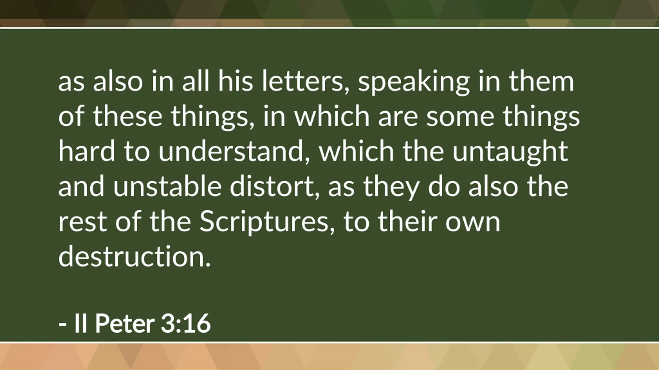 as also in all his letters, speaking in them of these things, in which are some things hard to understand, which the untaught and unstable distort, as they do also the rest of the Scriptures, to their own destruction. - - II Peter 3:16 II Peter 3:16