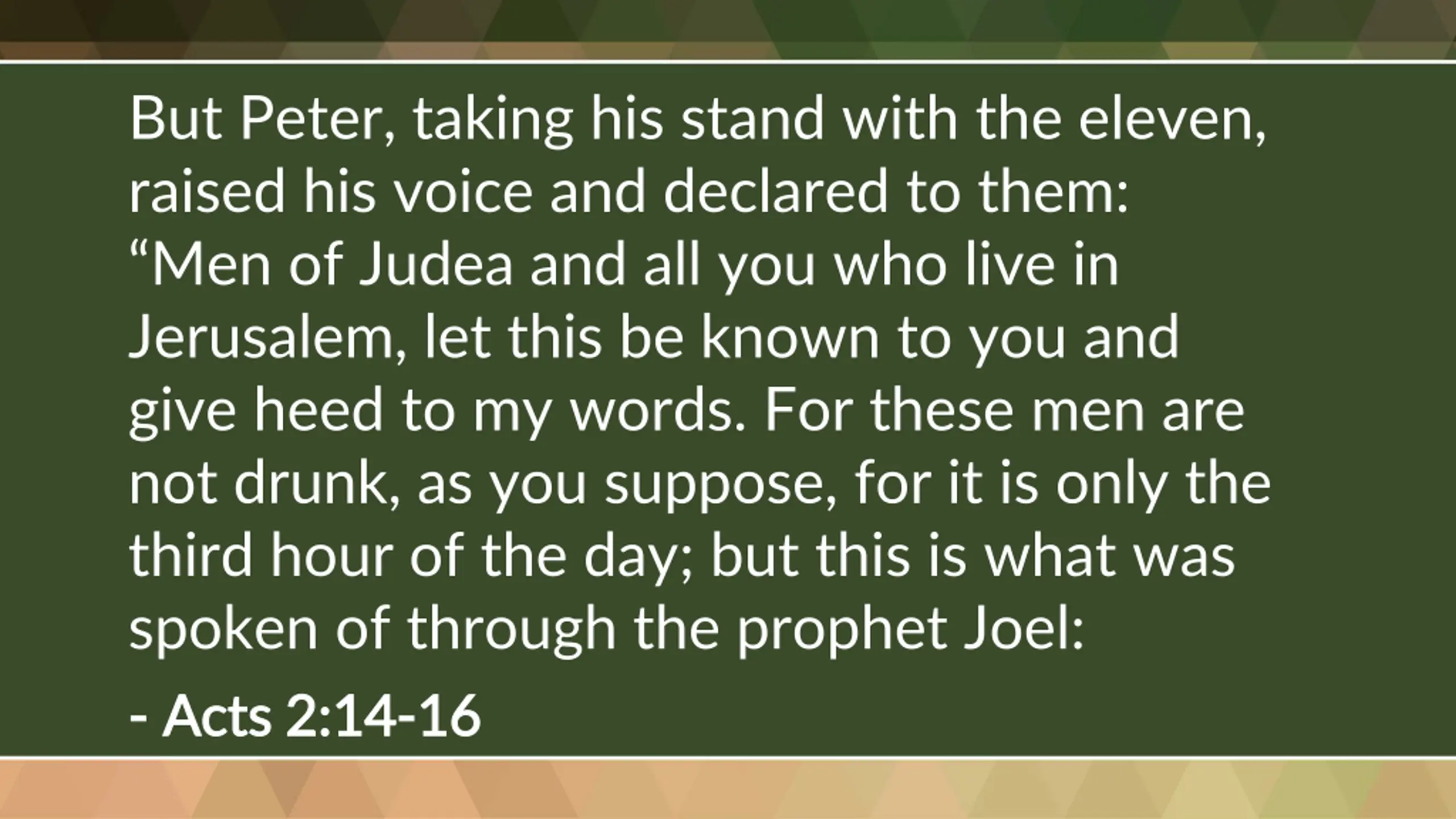 But Peter, taking his stand with the eleven, raised his voice and declared to them: Men of Judea and all you who live in Jerusalem, let this be known to you and give heed to my words. For these men are not drunk, as you suppose, for it is only the third hour of the day; but this is what was spoken of through the prophet Joel: - - Acts 2:14 Acts 2:14- -16 16