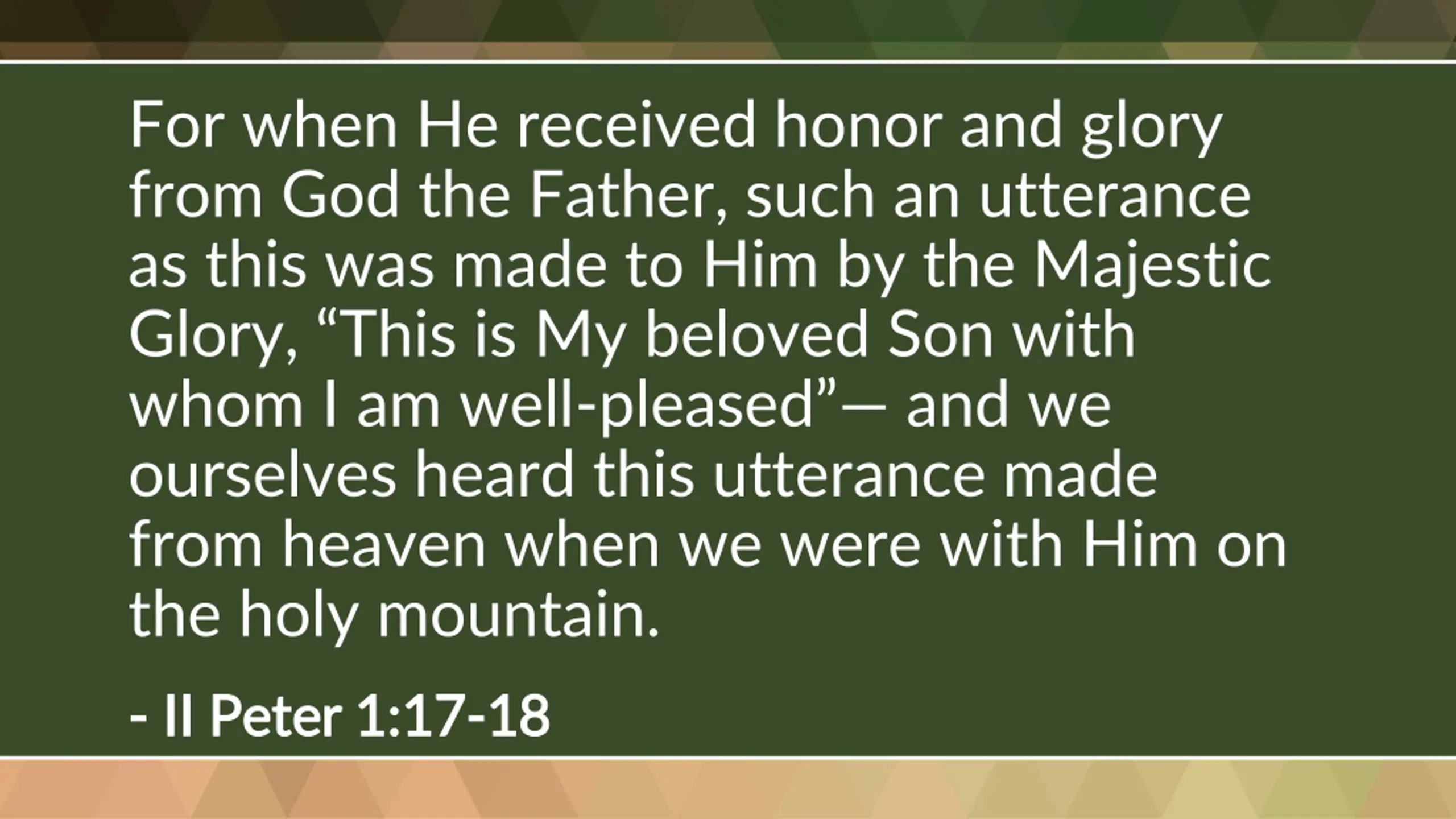 For when He received honor and glory from God the Father, such an utterance as this was made to Him by the Majestic Glory, This is My beloved Son with whom I am well-pleased and we ourselves heard this utterance made from heaven when we were with Him on the holy mountain. - - II Peter 1:17 II Peter 1:17- -18 18