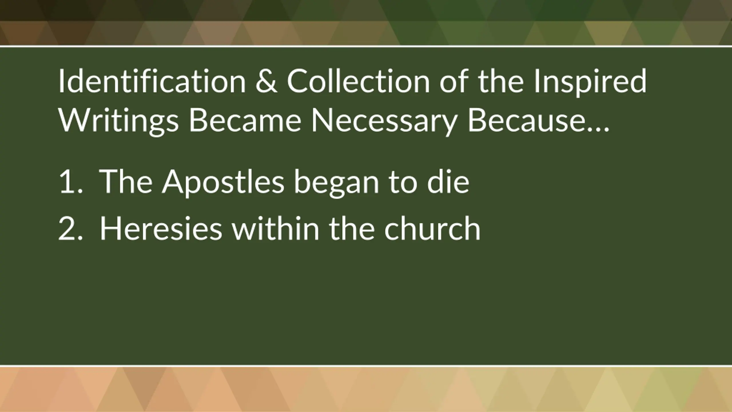 Identification & Collection of the Inspired Writings Became Necessary Because 1. The Apostles began to die 2. Heresies within the church