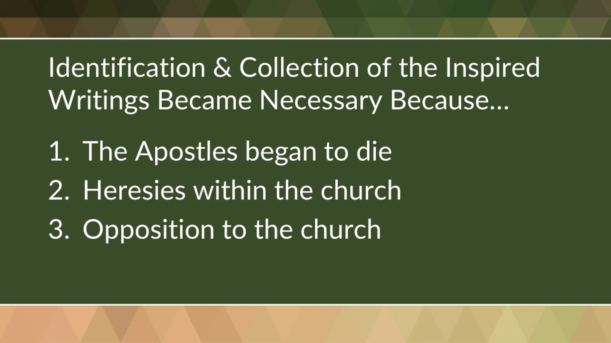 Identification & Collection of the Inspired Writings Became Necessary Because 1. The Apostles began to die 2. Heresies within the church 3. Opposition to the church