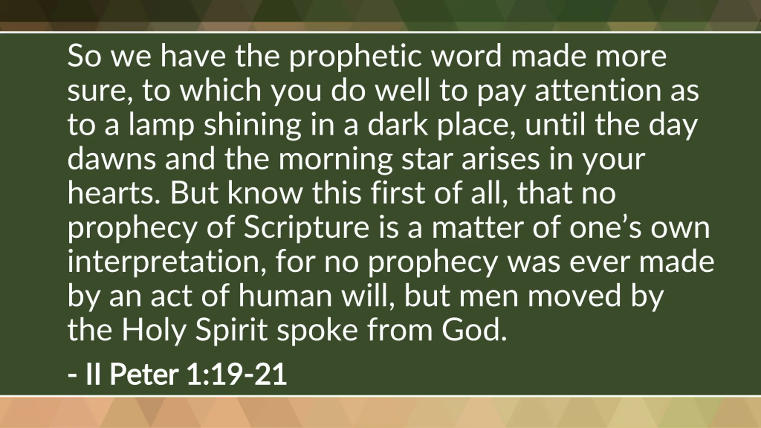 So we have the prophetic word made more sure, to which you do well to pay attention as to a lamp shining in a dark place, until the day dawns and the morning star arises in your hearts. But know this first of all, that no prophecy of Scripture is a matter of one s own interpretation, for no prophecy was ever made by an act of human will, but men moved by the Holy Spirit spoke from God. - - II Peter 1:19 II Peter 1:19- -21 21