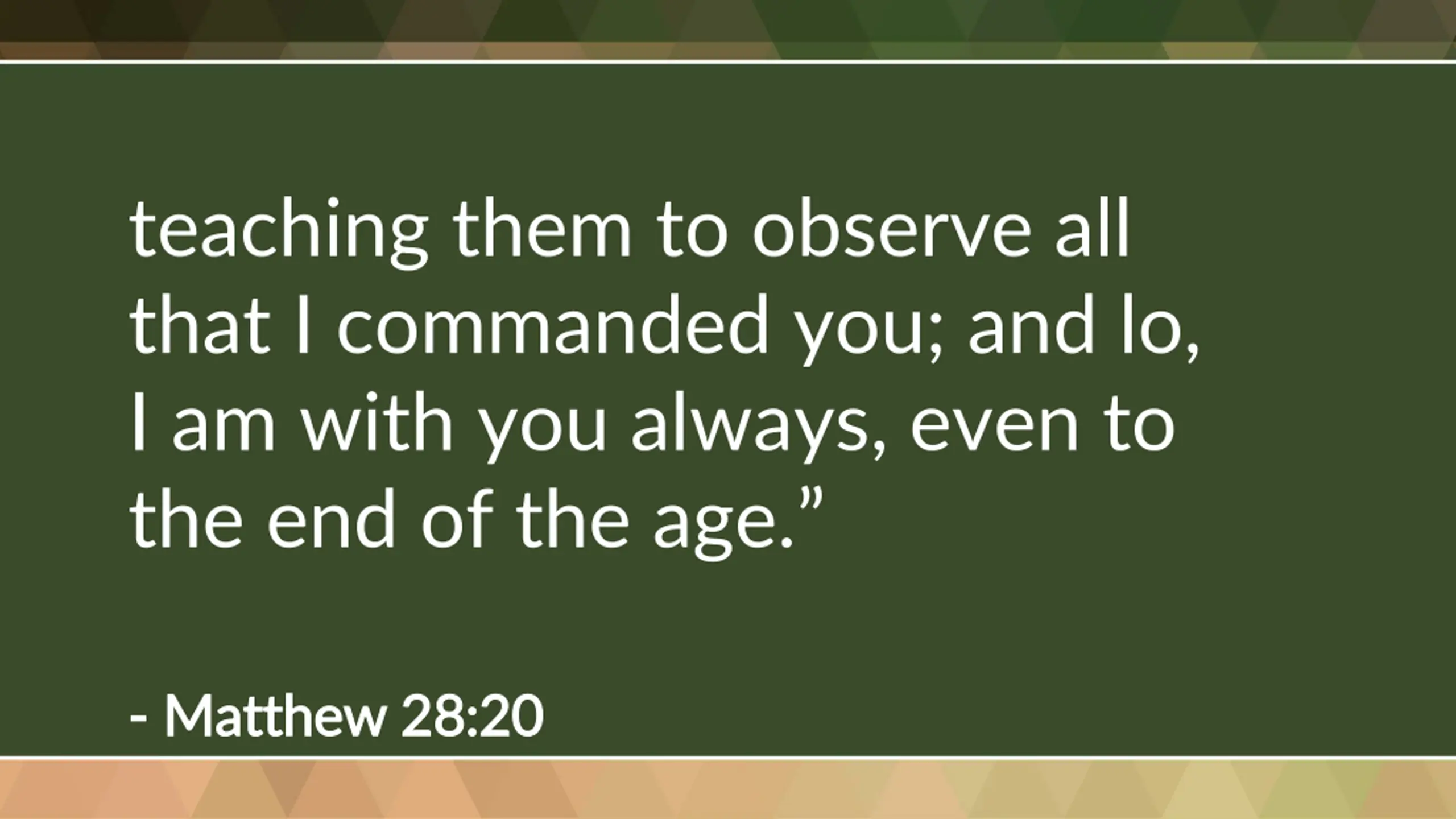 teaching them to observe all that I commanded you; and lo, I am with you always, even to the end of the age. - - Matthew 28: Matthew 28:20 20