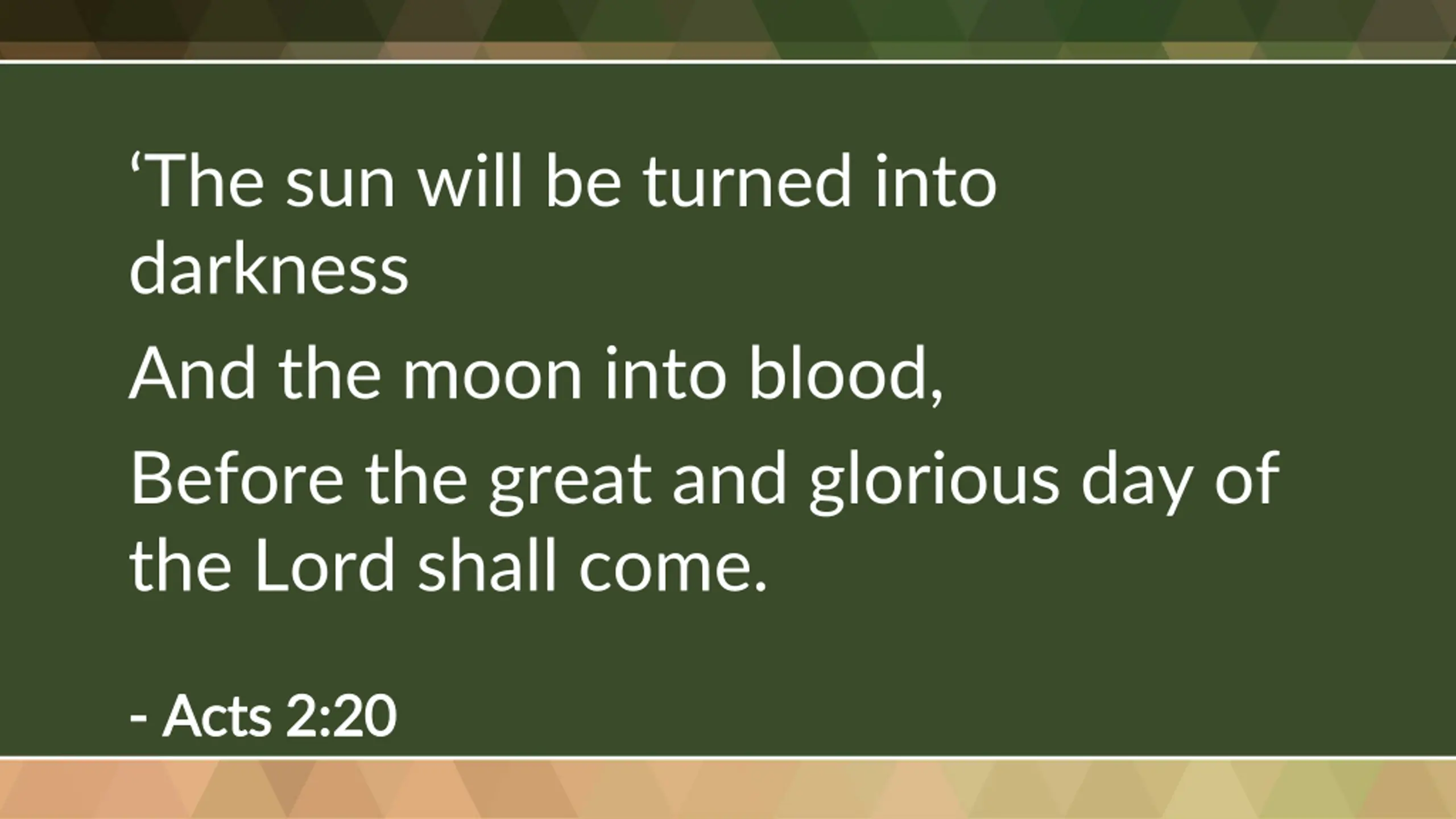 The sun will be turned into darkness And the moon into blood, Before the great and glorious day of the Lord shall come. - - Acts 2:20 Acts 2:20