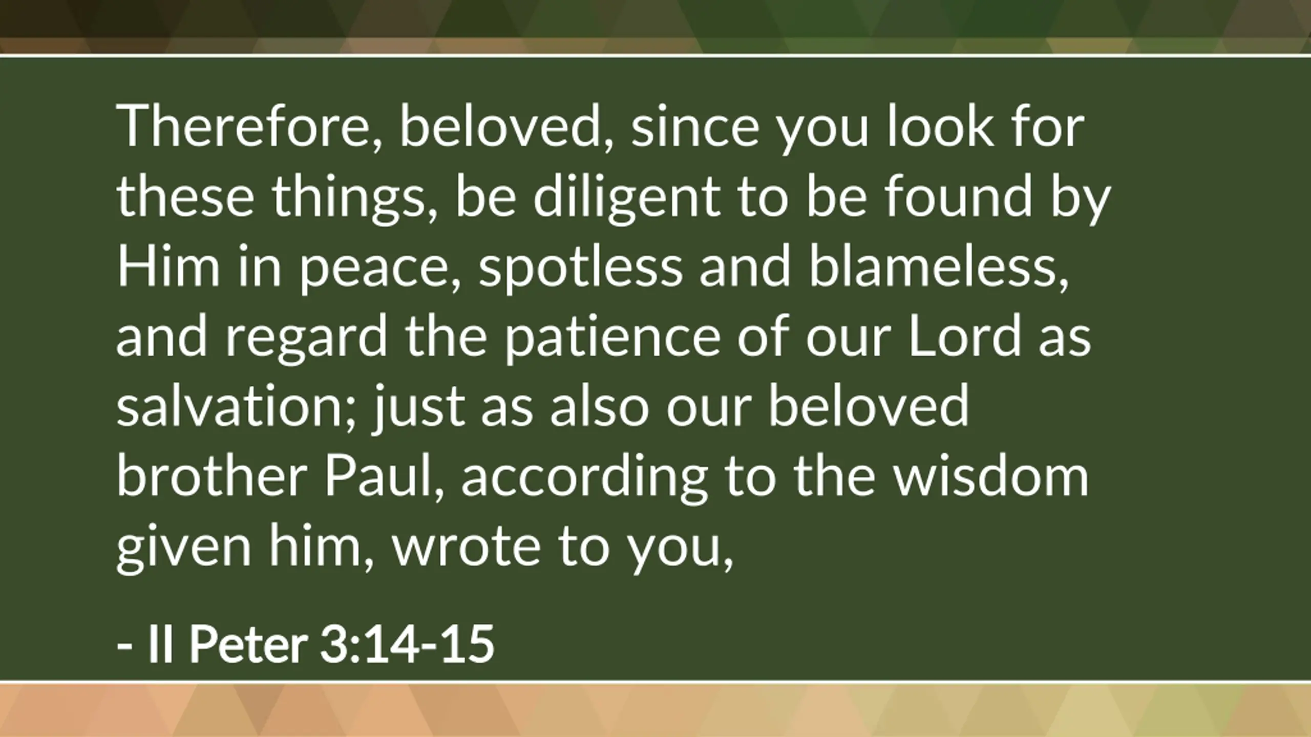 Therefore, beloved, since you look for these things, be diligent to be found by Him in peace, spotless and blameless, and regard the patience of our Lord as salvation; just as also our beloved brother Paul, according to the wisdom given him, wrote to you, - - II Peter 3:14 II Peter 3:14- -15 15