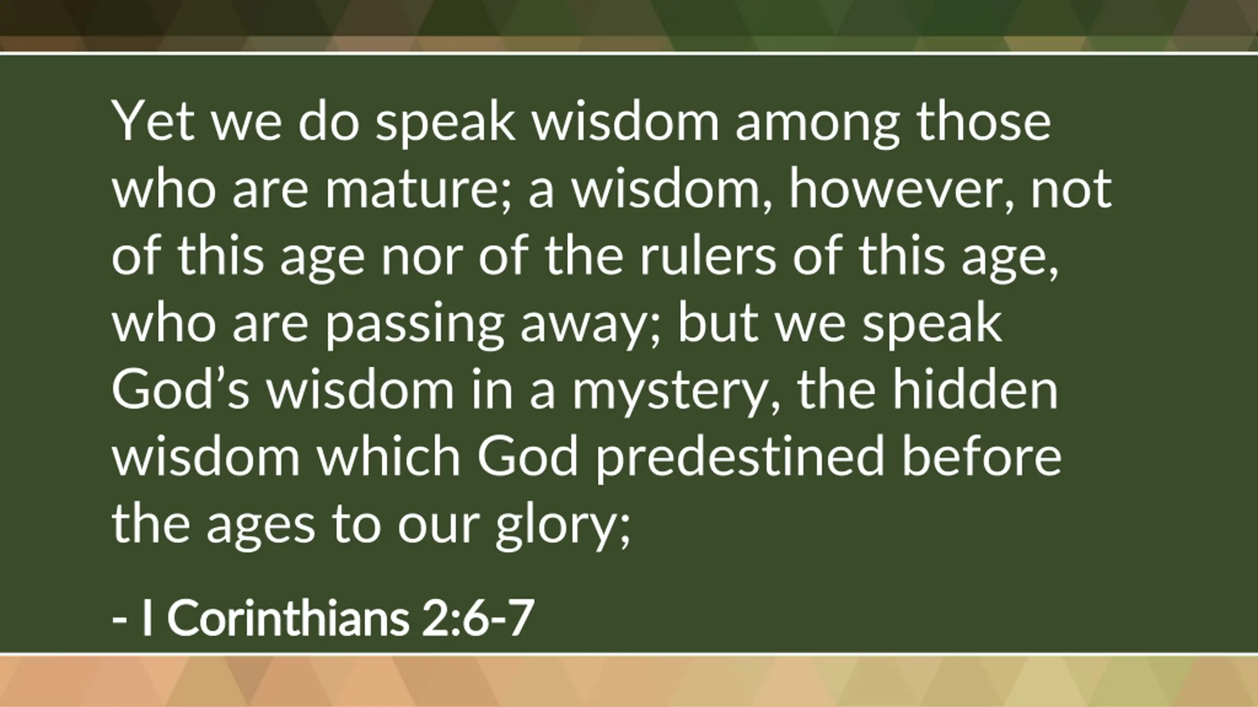 Yet we do speak wisdom among those who are mature; a wisdom, however, not of this age nor of the rulers of this age, who are passing away; but we speak God s wisdom in a mystery, the hidden wisdom which God predestined before the ages to our glory; - - I Corinthians 2:6 I Corinthians 2:6- -7 7