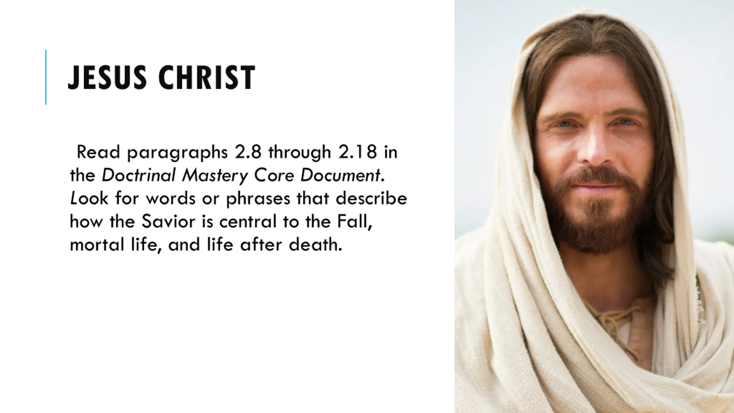 JESUS CHRIST Read paragraphs 2.8 through 2.18 in the Doctrinal Mastery Core Document. Look for words or phrases that describe how the Savior is central to the Fall, mortal life, and life after death.