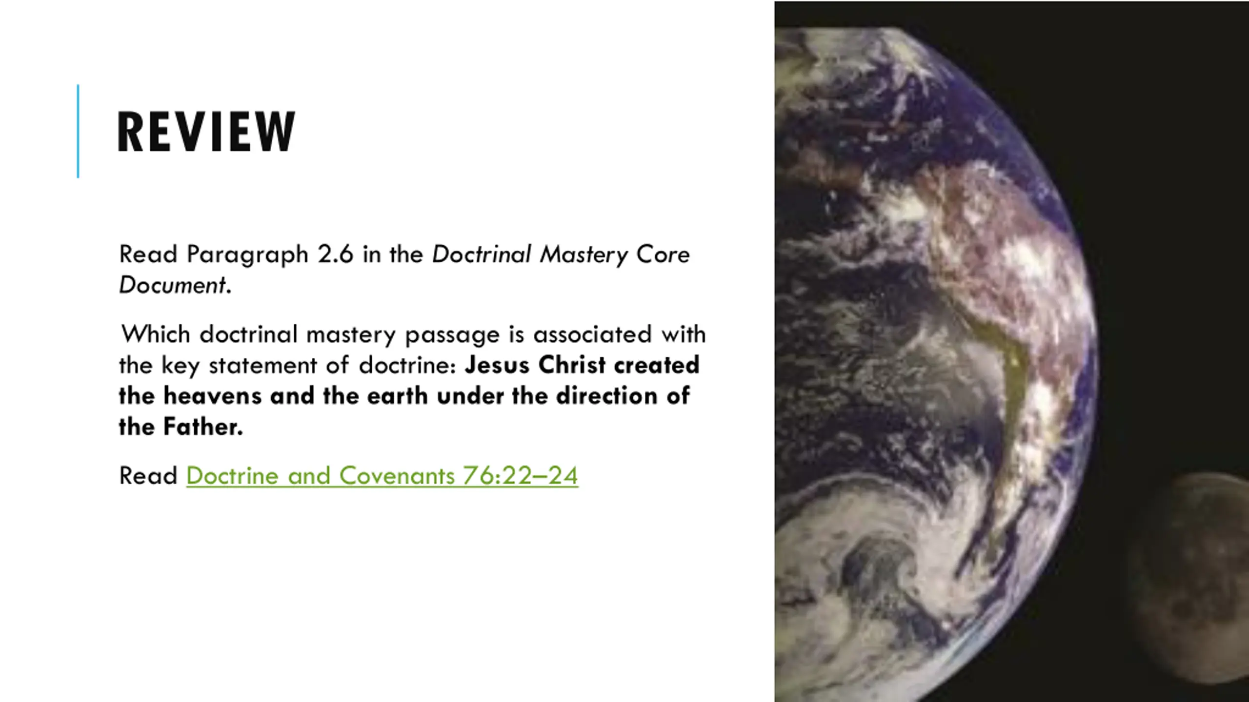 REVIEW Read Paragraph 2.6 in the Doctrinal Mastery Core Document. Which doctrinal mastery passage is associated with the key statement of doctrine: Jesus Christ created the heavens and the earth under the direction of the Father. Read Doctrine and Covenants 76:22 24
