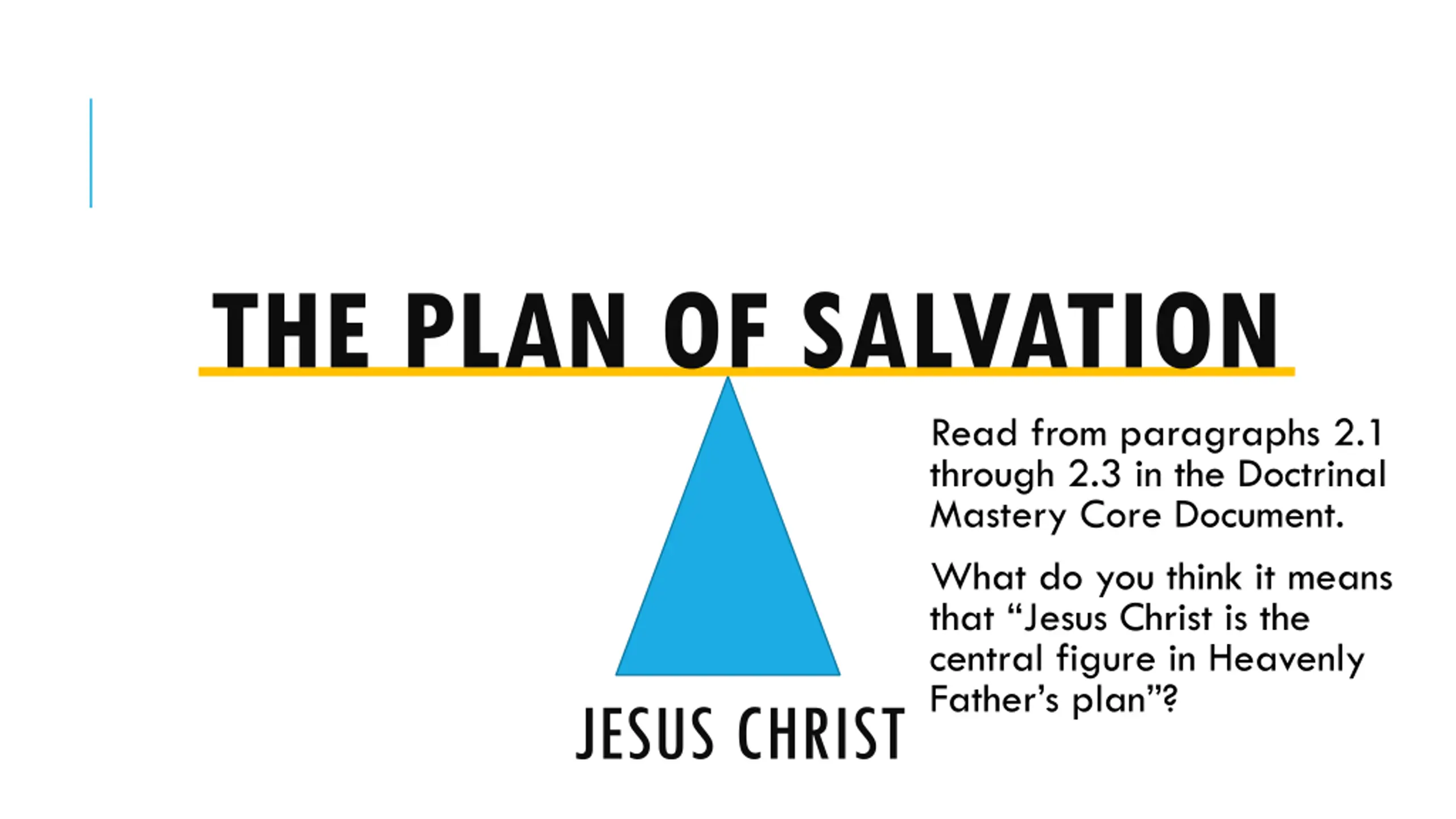 THE PLAN OF SALVATION Read from paragraphs 2.1 through 2.3 in the Doctrinal Mastery Core Document. What do you think it means that Jesus Christ is the central figure in Heavenly Father s plan ? JESUS CHRIST
