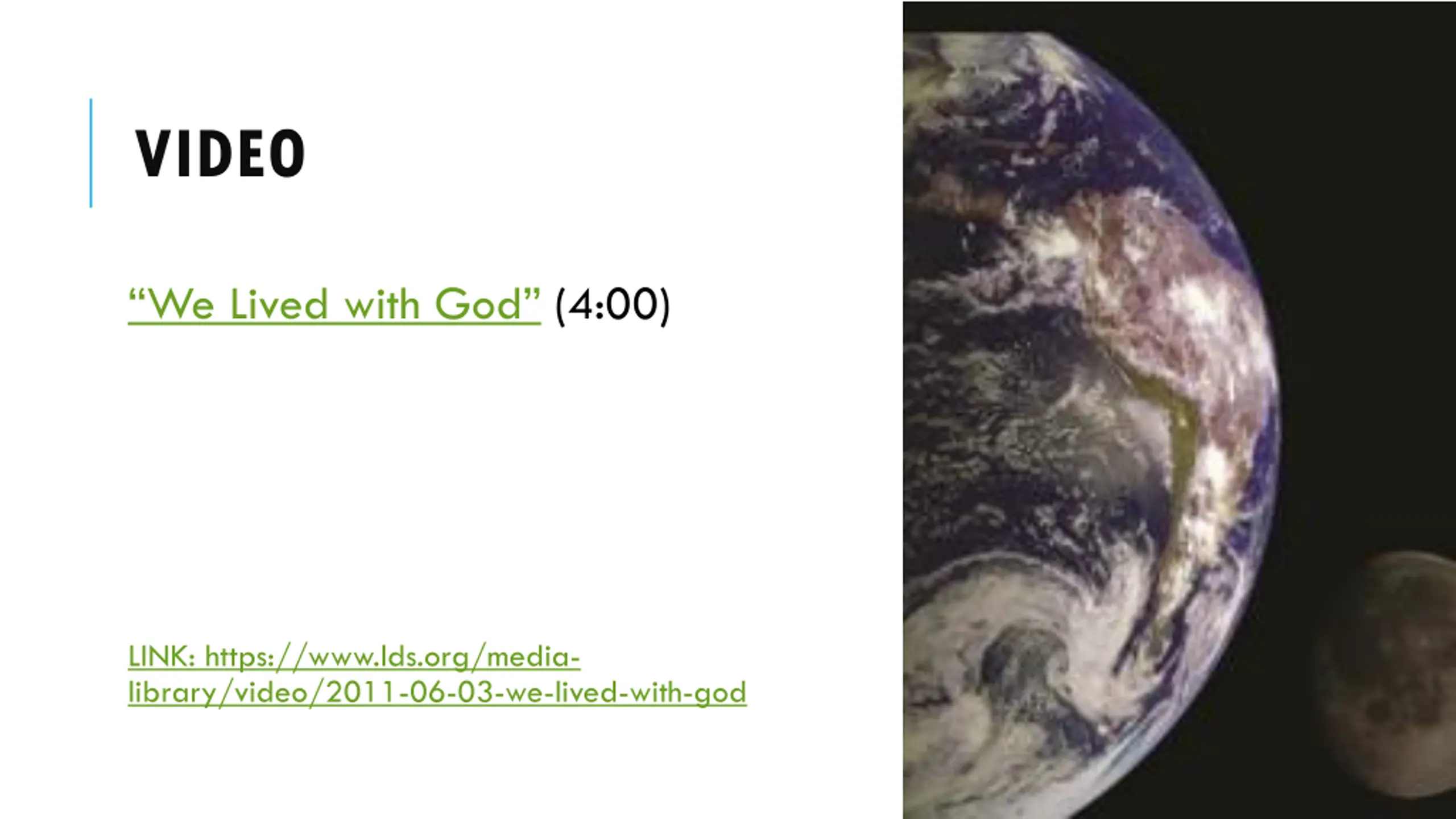 VIDEO We Lived with God (4:00) LINK: https://www.lds.org/media- library/video/2011-06-03-we-lived-with-god
