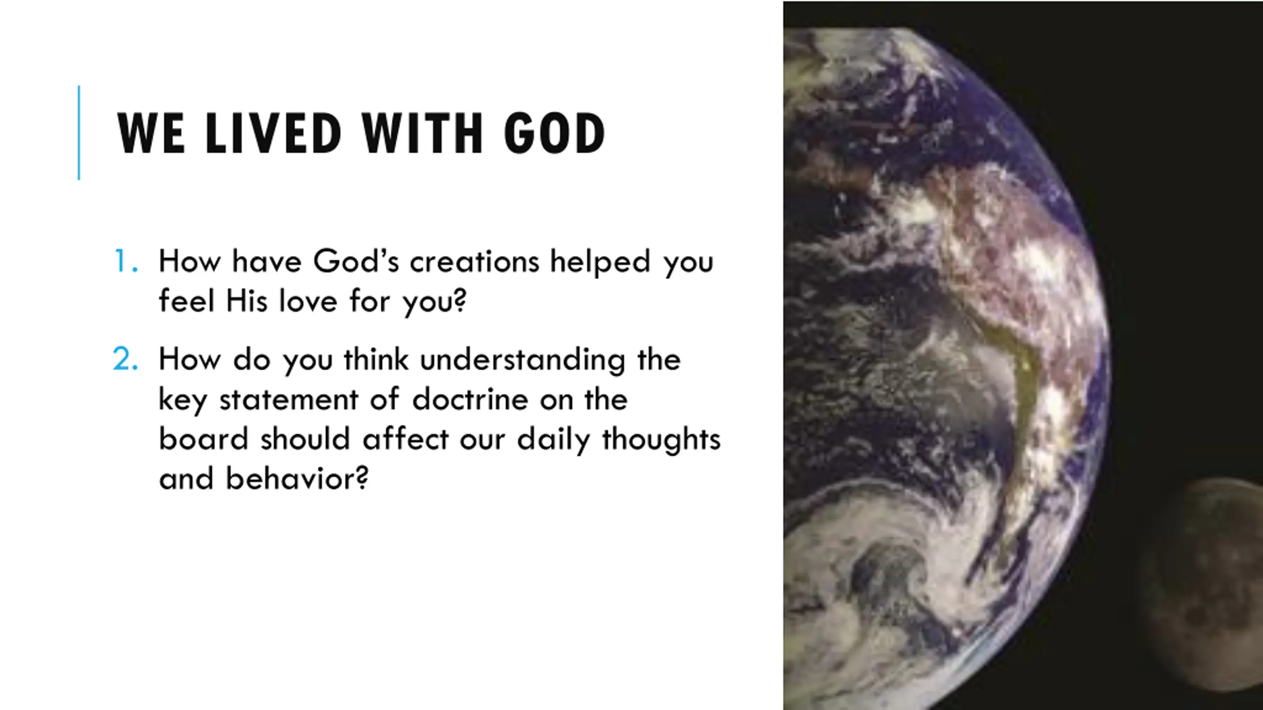 WE LIVED WITH GOD 1. How have God s creations helped you feel His love for you? 2. How do you think understanding the key statement of doctrine on the board should affect our daily thoughts and behavior?