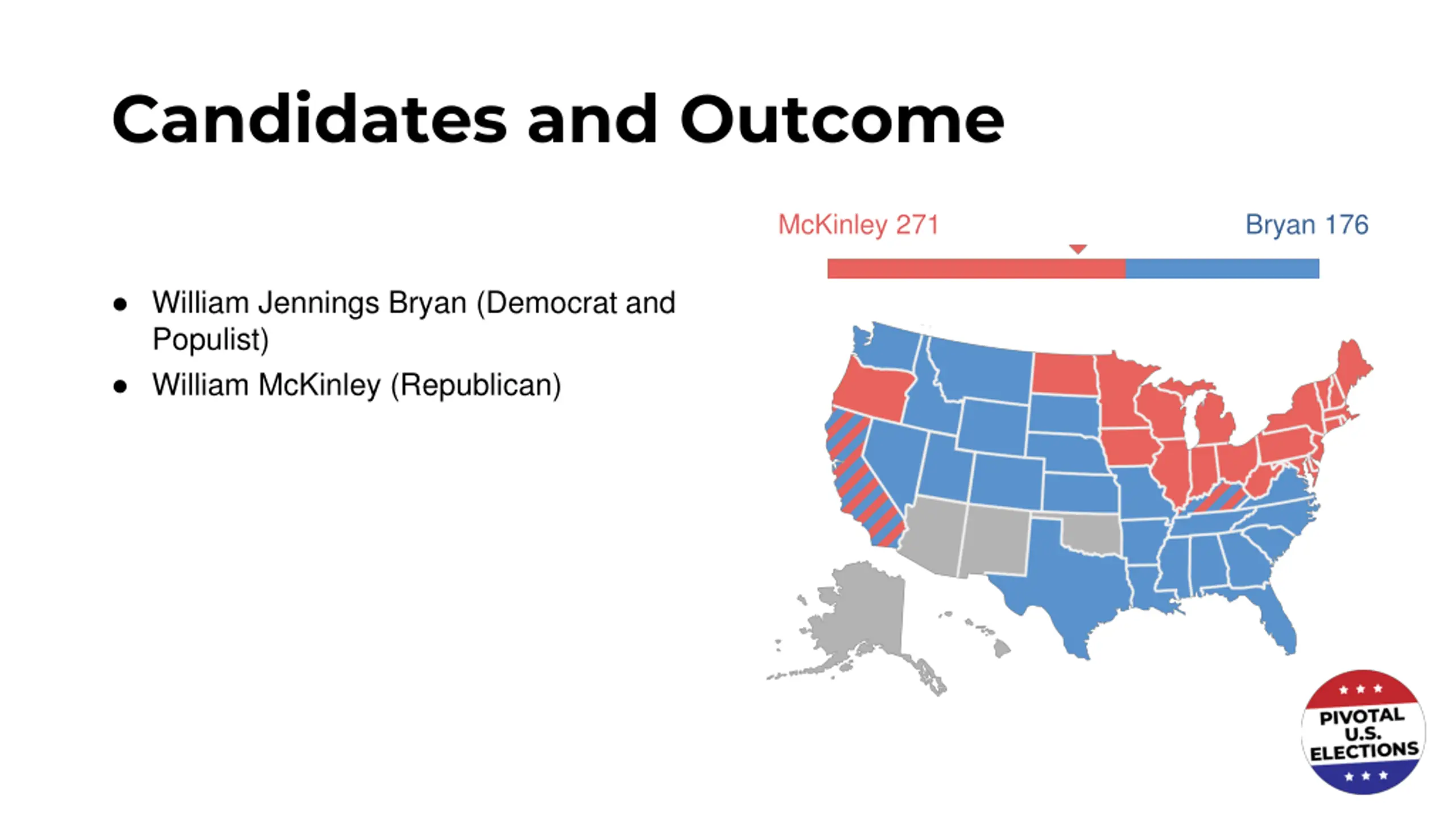 Candidates and Outcome McKinley 271 Bryan 176 William Jennings Bryan (Democrat and Populist) William McKinley (Republican)