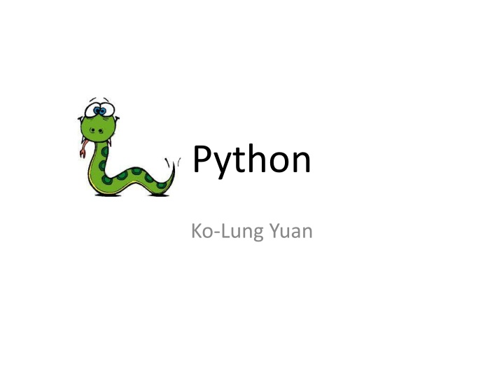 Useful Websites http://ez2learn.com/index.php/python- tutorials http://wiki.python.org.tw/ http://caterpillar.onlyfun.net/Gossip/Python/i ndex.html http://pypi.python.org/pypi