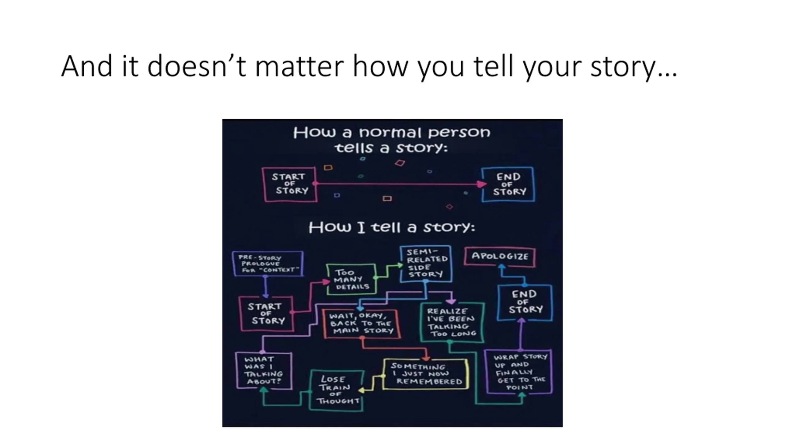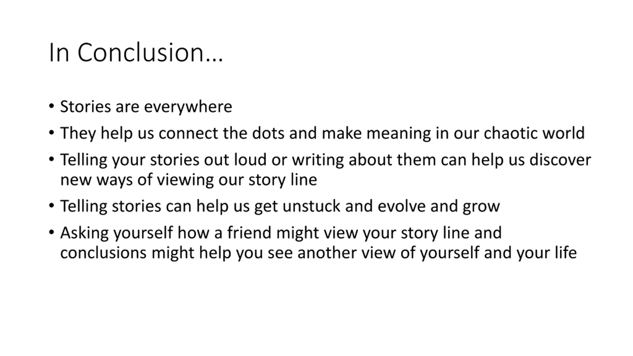 In Conclusion Stories are everywhere They help us connect the dots and make meaning in our chaotic world Telling your stories out loud or writing about them can help us discover new ways of viewing our story line Telling stories can help us get unstuck and evolve and grow Asking yourself how a friend might view your story line and conclusions might help you see another view of yourself and your life
