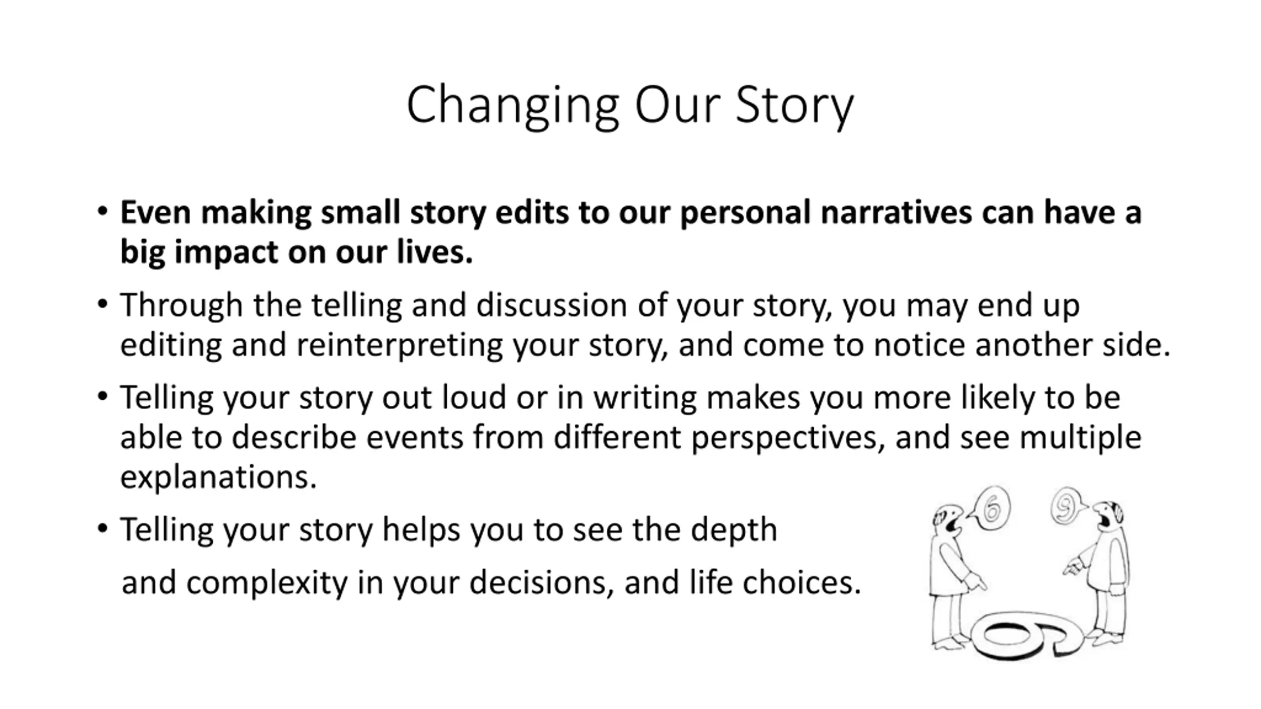 Changing Our Story Even making small story edits to our personal narratives can have a big impact on our lives. Through the telling and discussion of your story, you may end up editing and reinterpreting your story, and come to notice another side. Telling your story out loud or in writing makes you more likely to be able to describe events from different perspectives, and see multiple explanations. Telling your story helps you to see the depth and complexity in your decisions, and life choices.