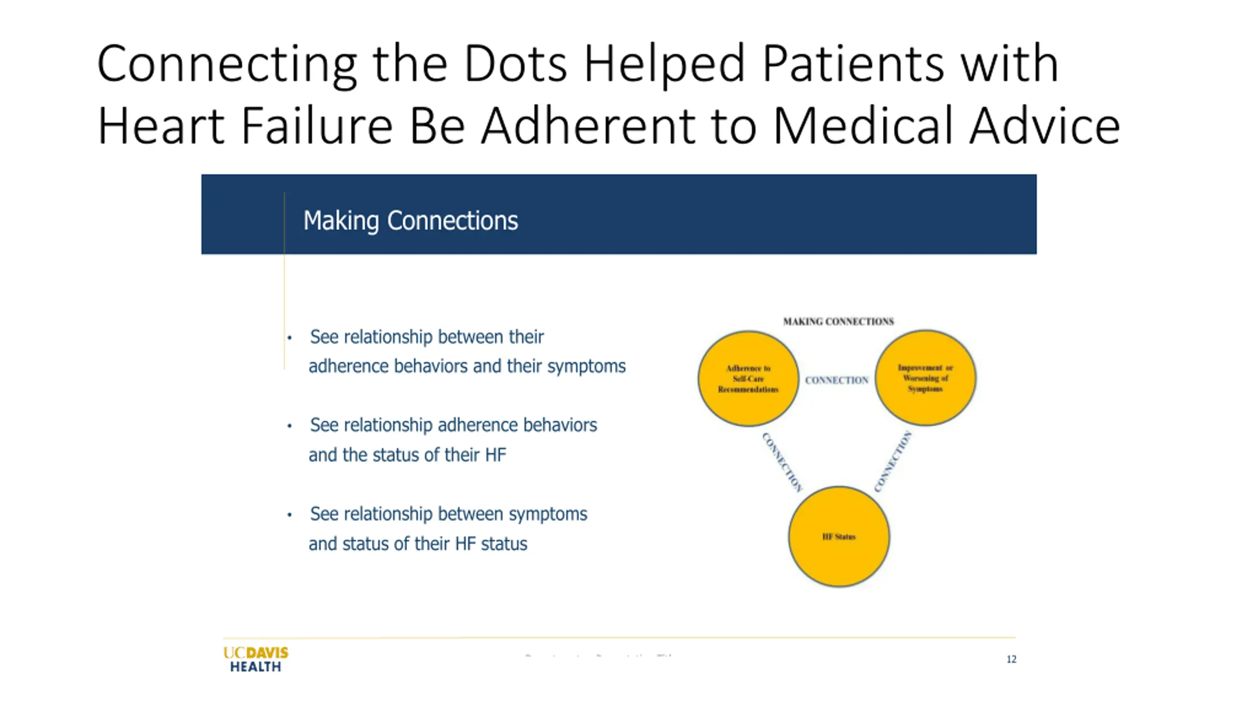 Connecting the Dots Helped Patients with Heart Failure Be Adherent to Medical Advice Making Connections See relationship between their adherence behaviors and their symptoms See relationship adherence behaviors and the status of their HF See relationship between symptoms and status of their HF status Department or Presentation Title 12