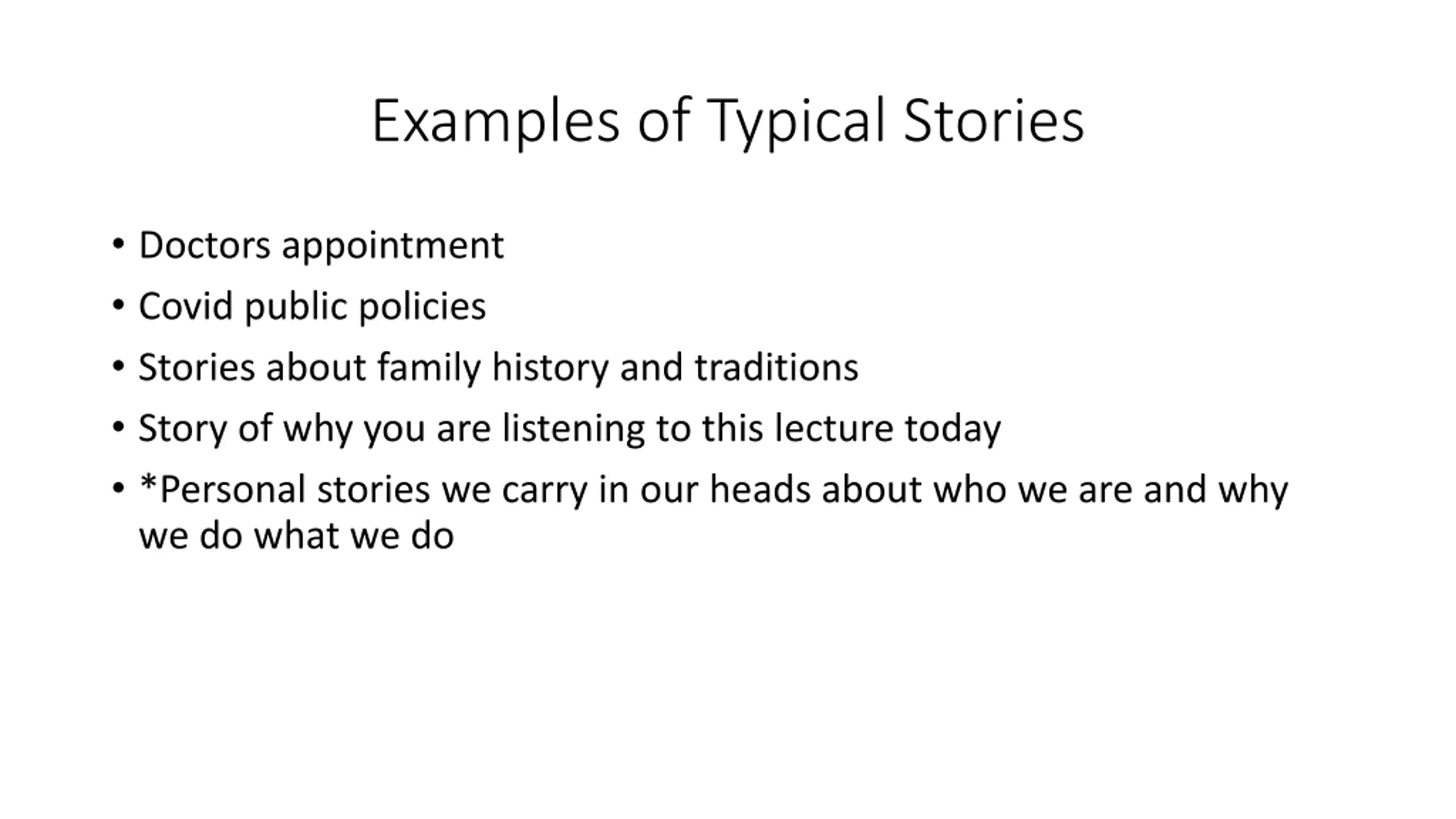 Examples of Typical Stories Doctors appointment Covid public policies Stories about family history and traditions Story of why you are listening to this lecture today *Personal stories we carry in our heads about who we are and why we do what we do